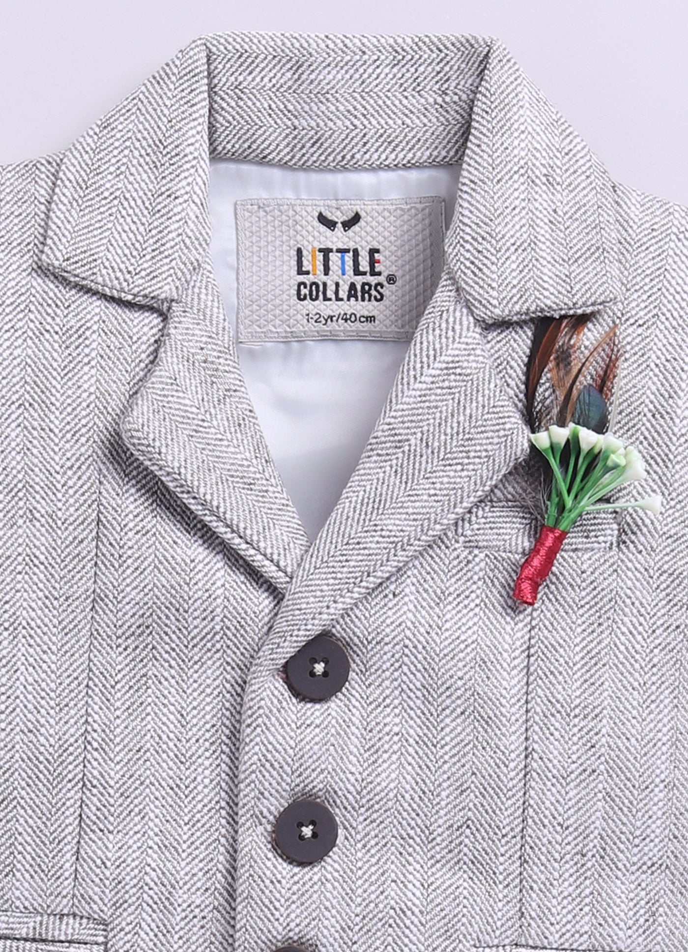 This outfit is perfect for dressing up a young boy for any formal and fun occasion. The combination of the deep coloured pants with matching textured self weave waistcoat, the classic design elements, and the attention to detail like floral brooch creates a stylish and sophisticated look that is sure to make him stand out.