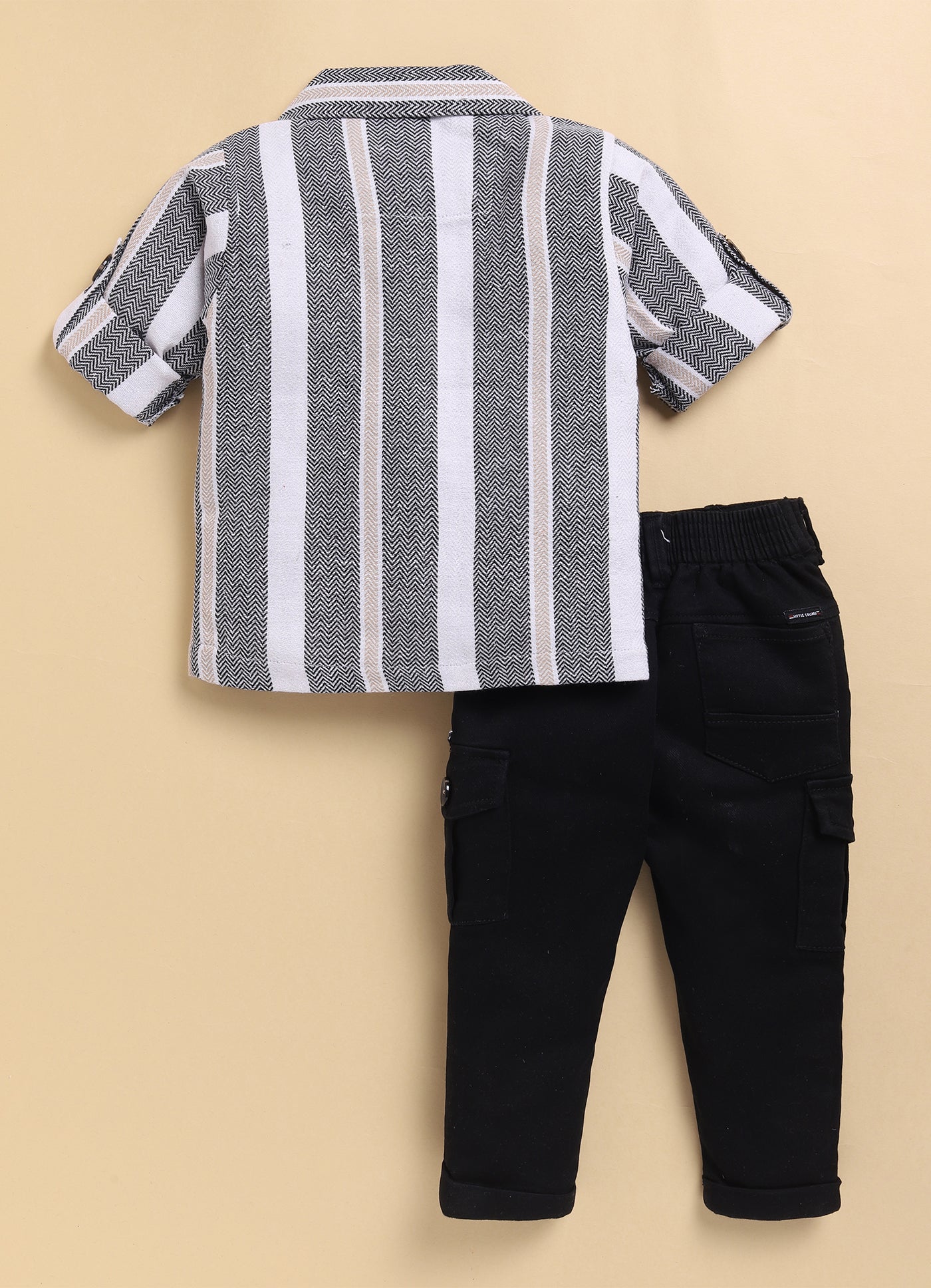 Black Recycled Cotton Striped Casual Full Sleeves Overshirt and Tshirt Pants Set