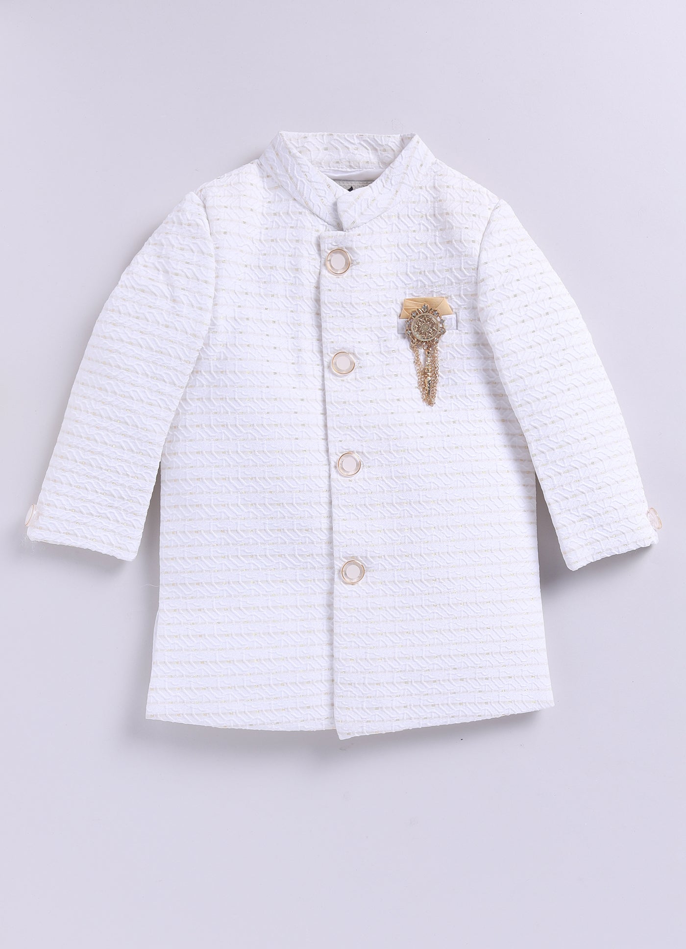 Blended Full Sleeves Self Design Jaquard & Zari Work Achkan & Dhoti Style Pant with Brooch and Necklace Ethnic Set- White