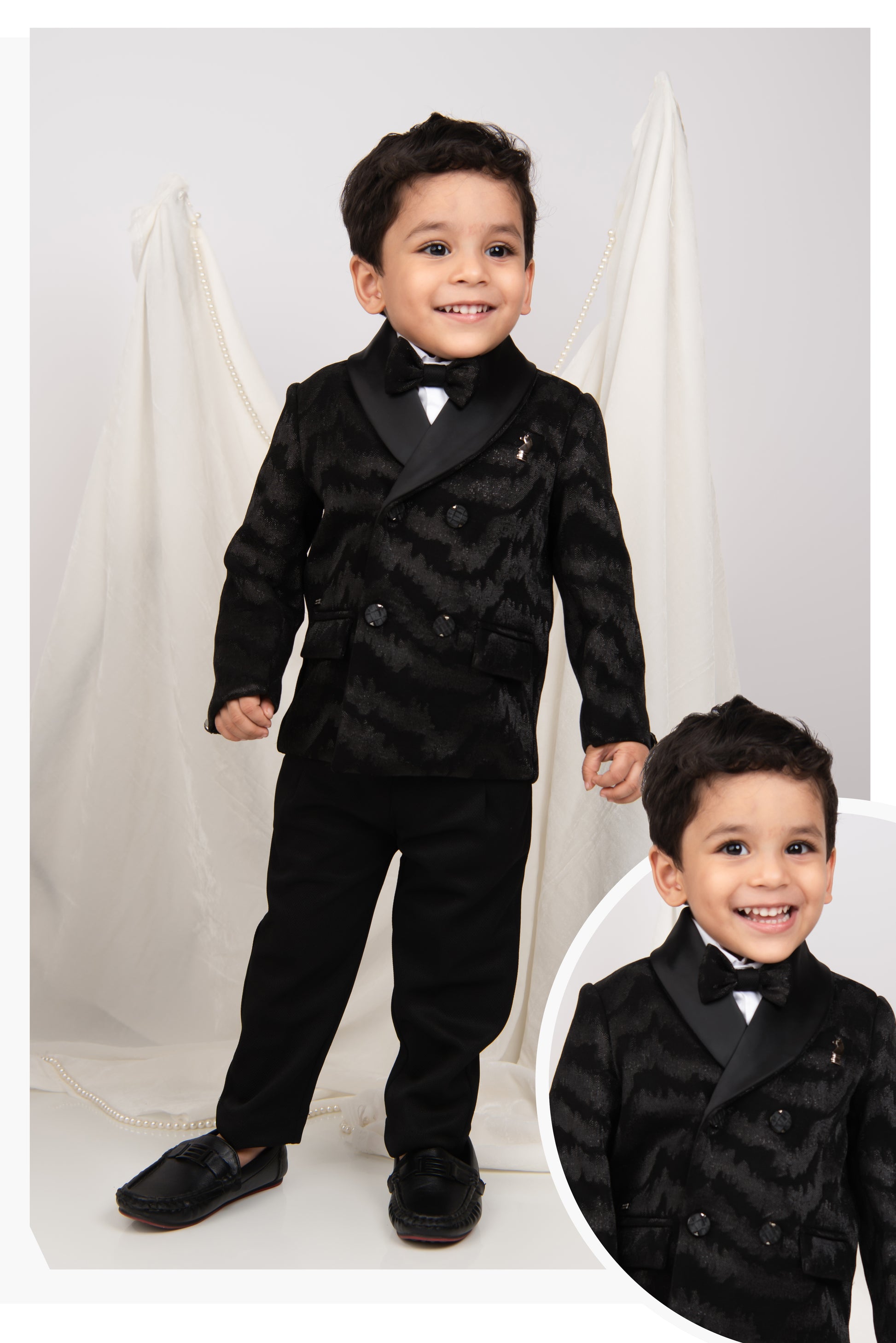 Classic, elegant formal wear, suitable for events like weddings, parties, or other special occasions. A  shiny jaquard blazer with notch lapels and elegant button details with matching pant cord. A white dress tuxedo shirt underneath with beautiful black buttons and exclusive bow tie makes the piece look dapper.