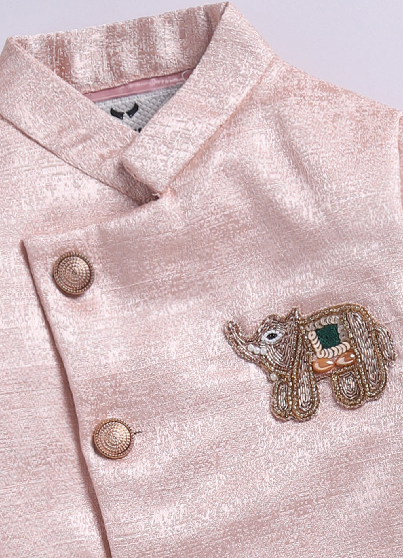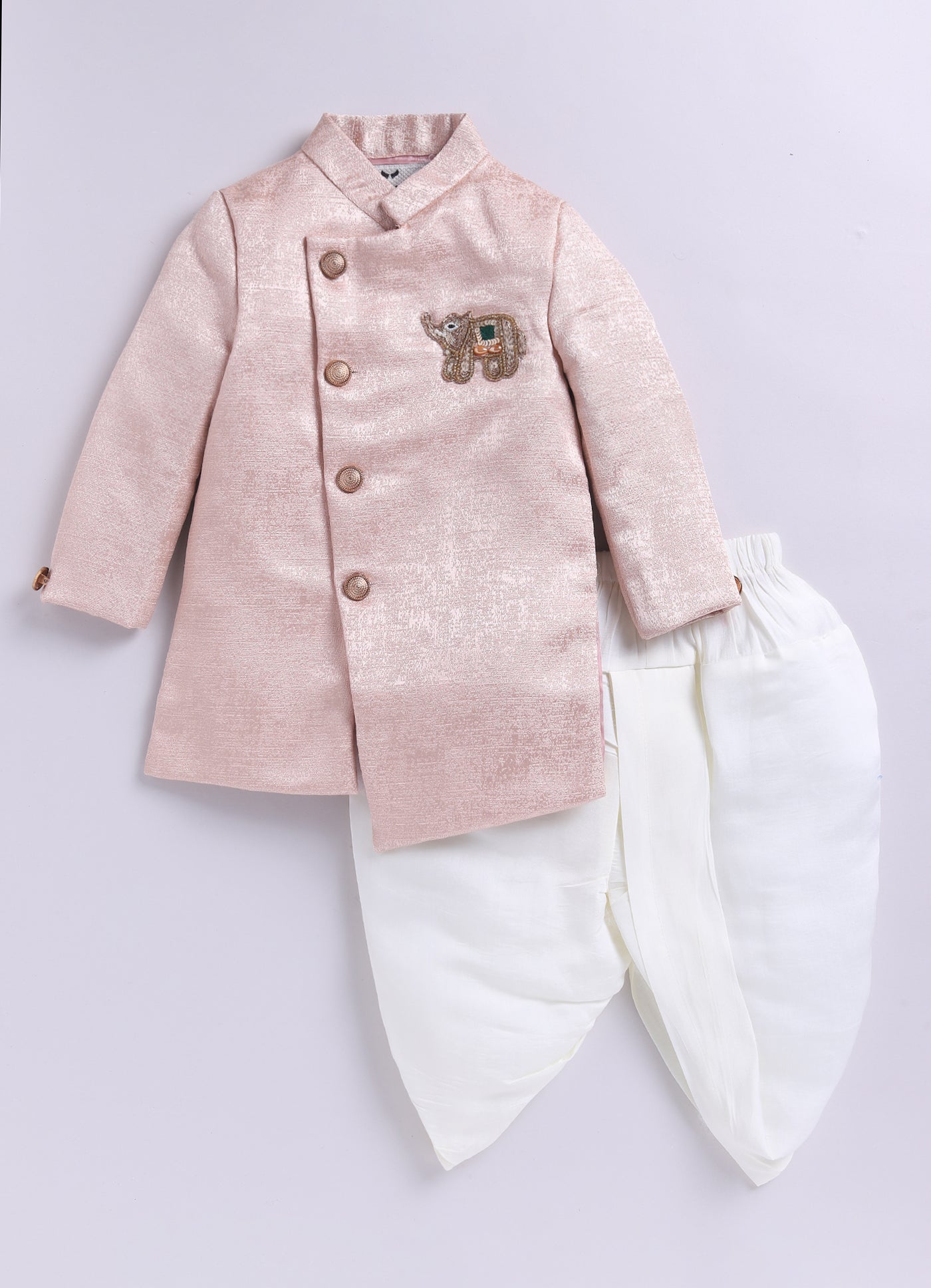 Blended Silk Full Sleeves Self Texture Elephant Hand Embroidered Achkan Bandh gala with Dhoti Ethnic wear Set- Peach