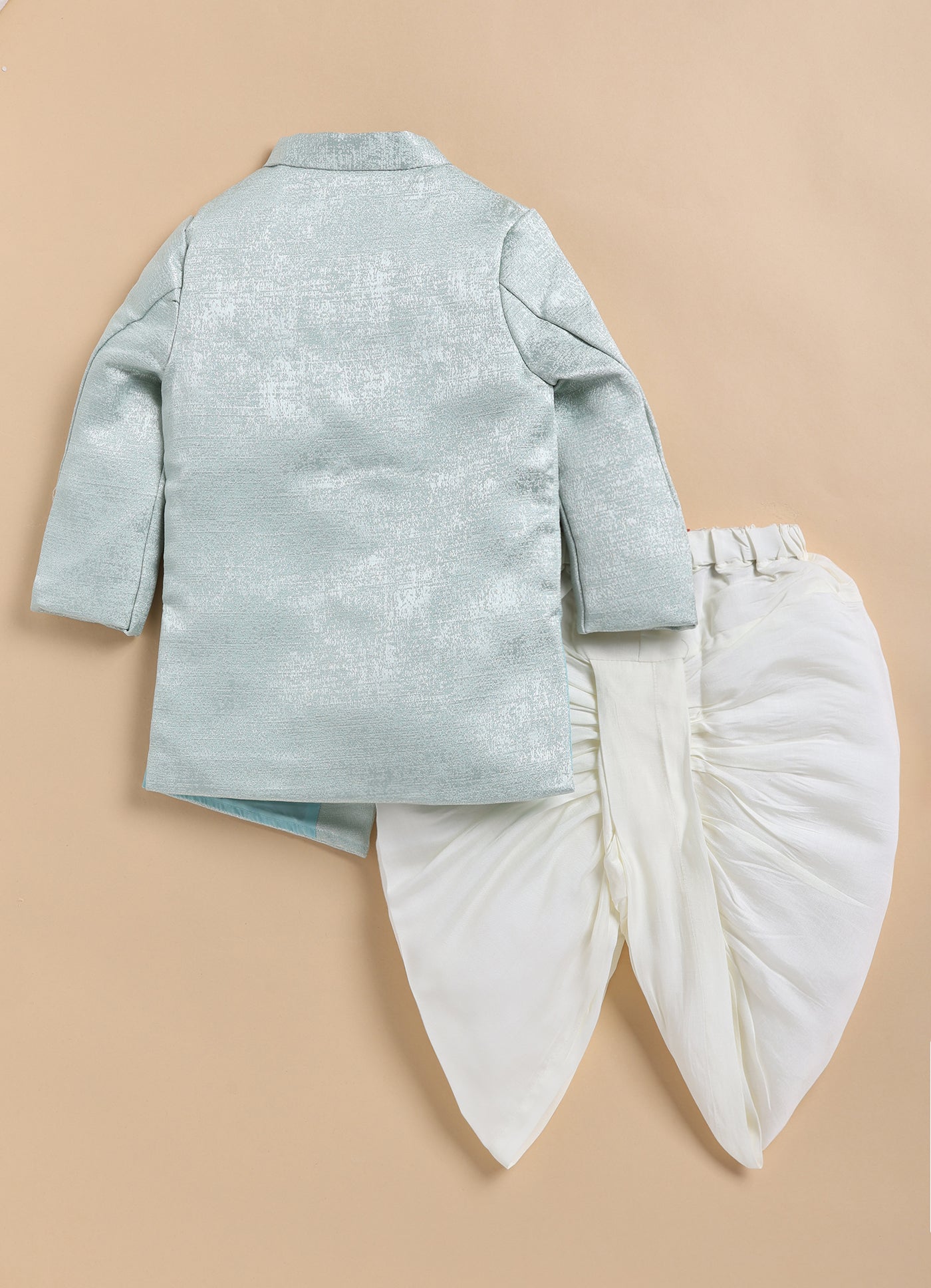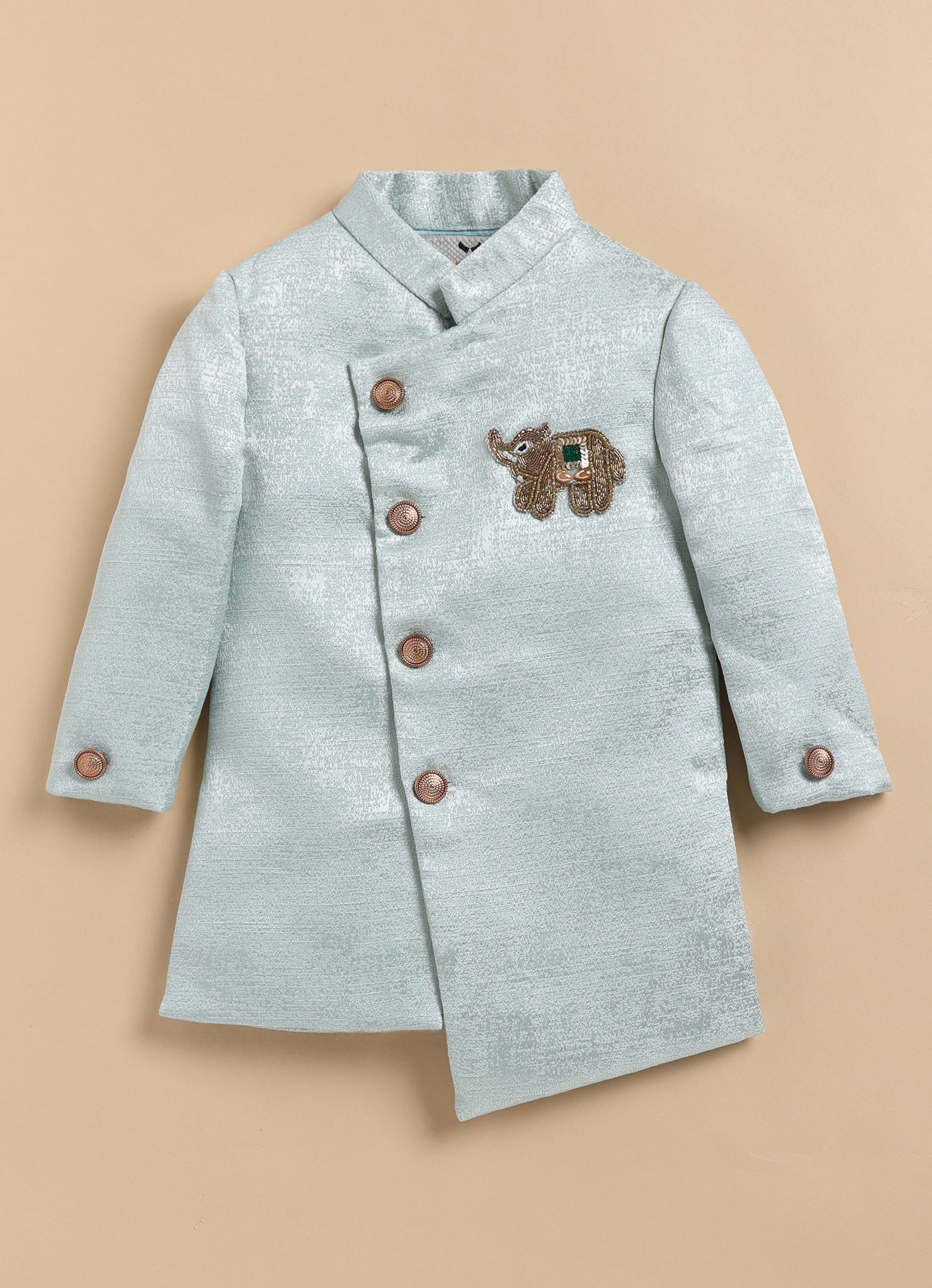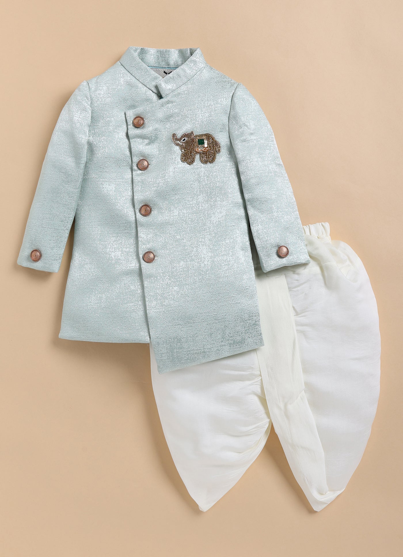 This LITTLE COLLARS fashion-forward silhouette is timeless and aesthetically beautiful. An ideal piece for all Rakhi/Diwali/Ramadan/Indian parties and weddings! Elegant Prince Sherwani Coat has beautiful elephant motif and is paired with dhoti. This set is a perfect combination of opulence with comfort.