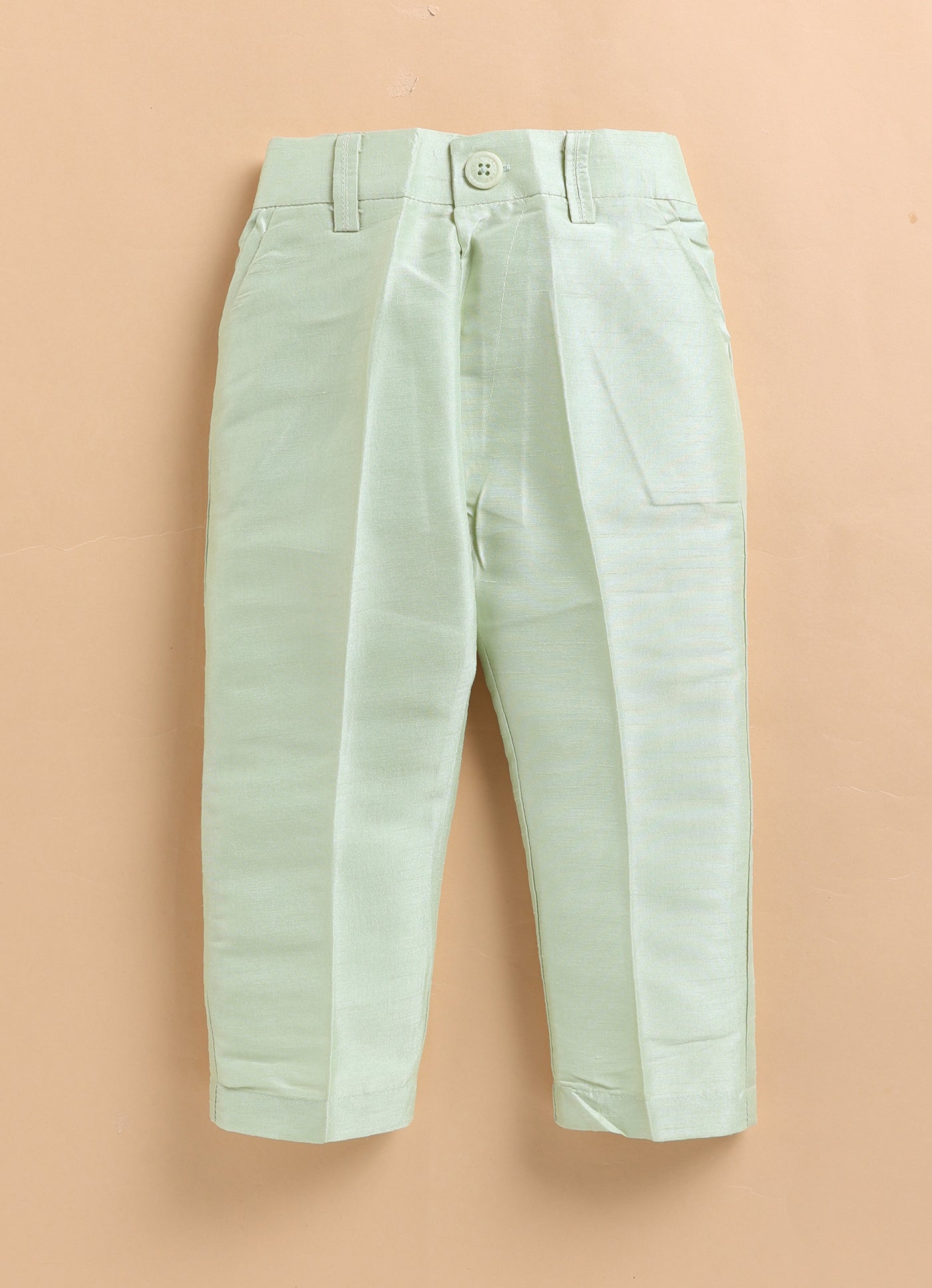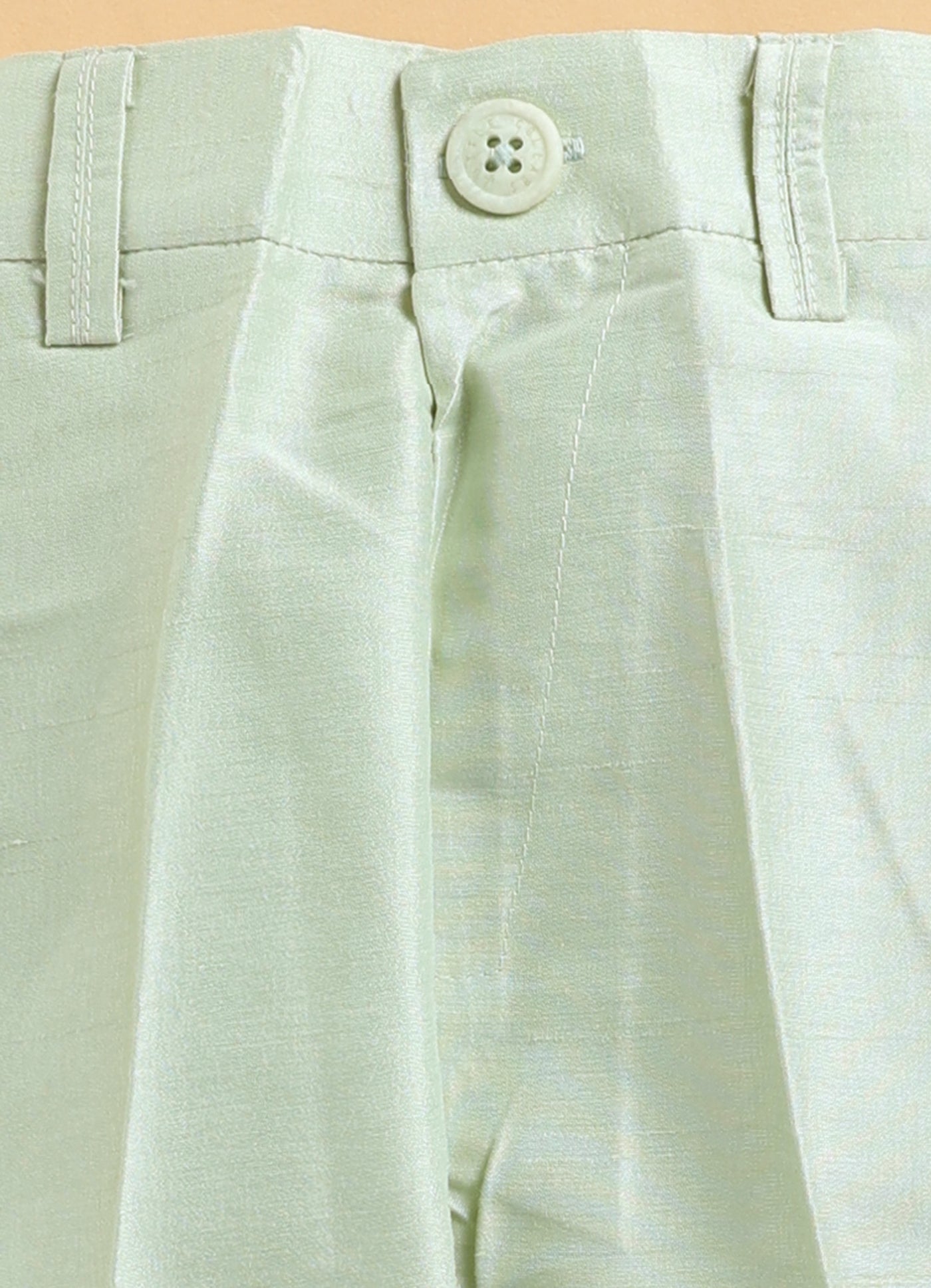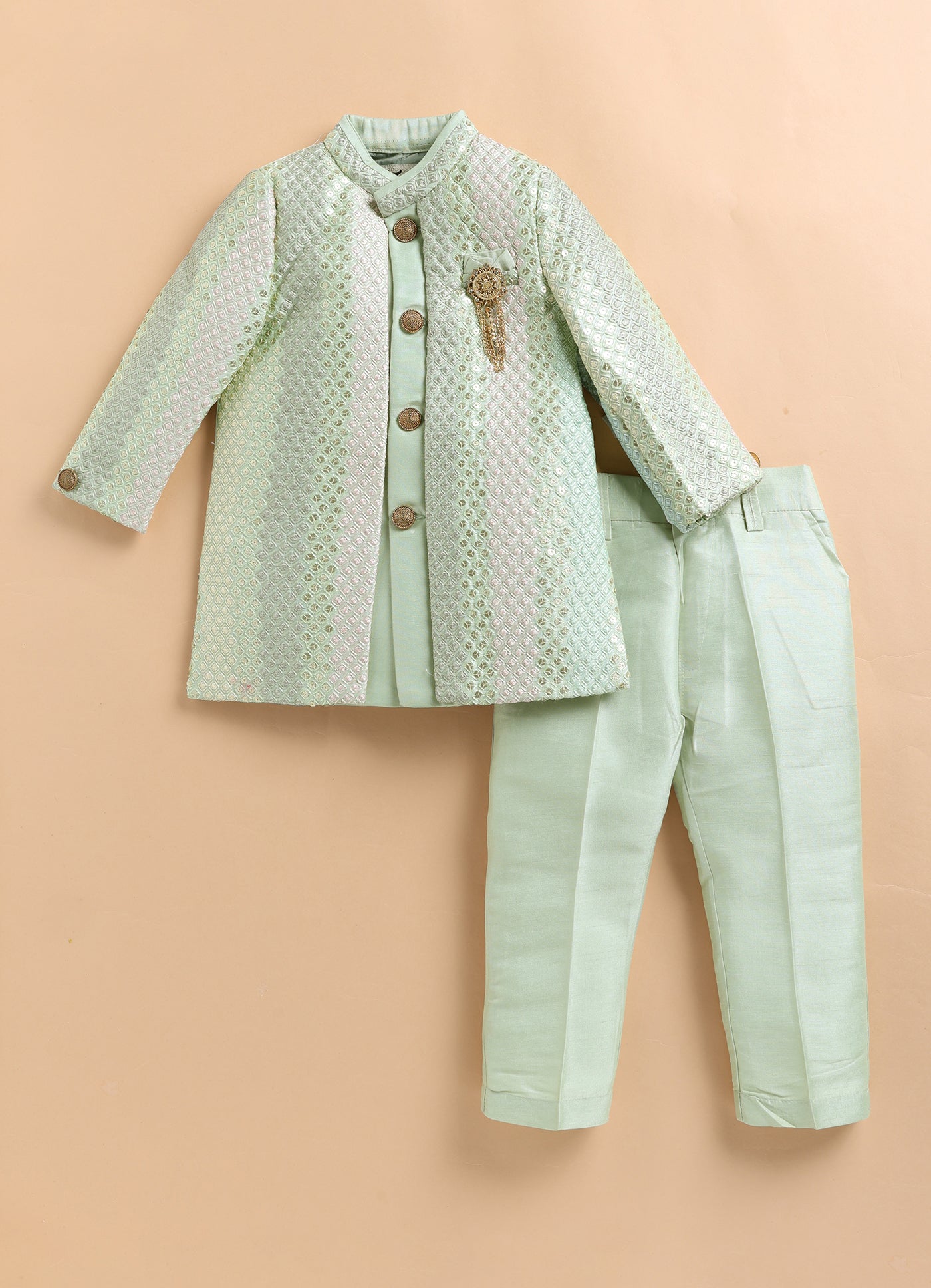 Blended Silk Full Sleeves Woven Sequins Embellished & Abstract Embroidered Achkan With Pyjama and Brooch Ethnic Set - Green