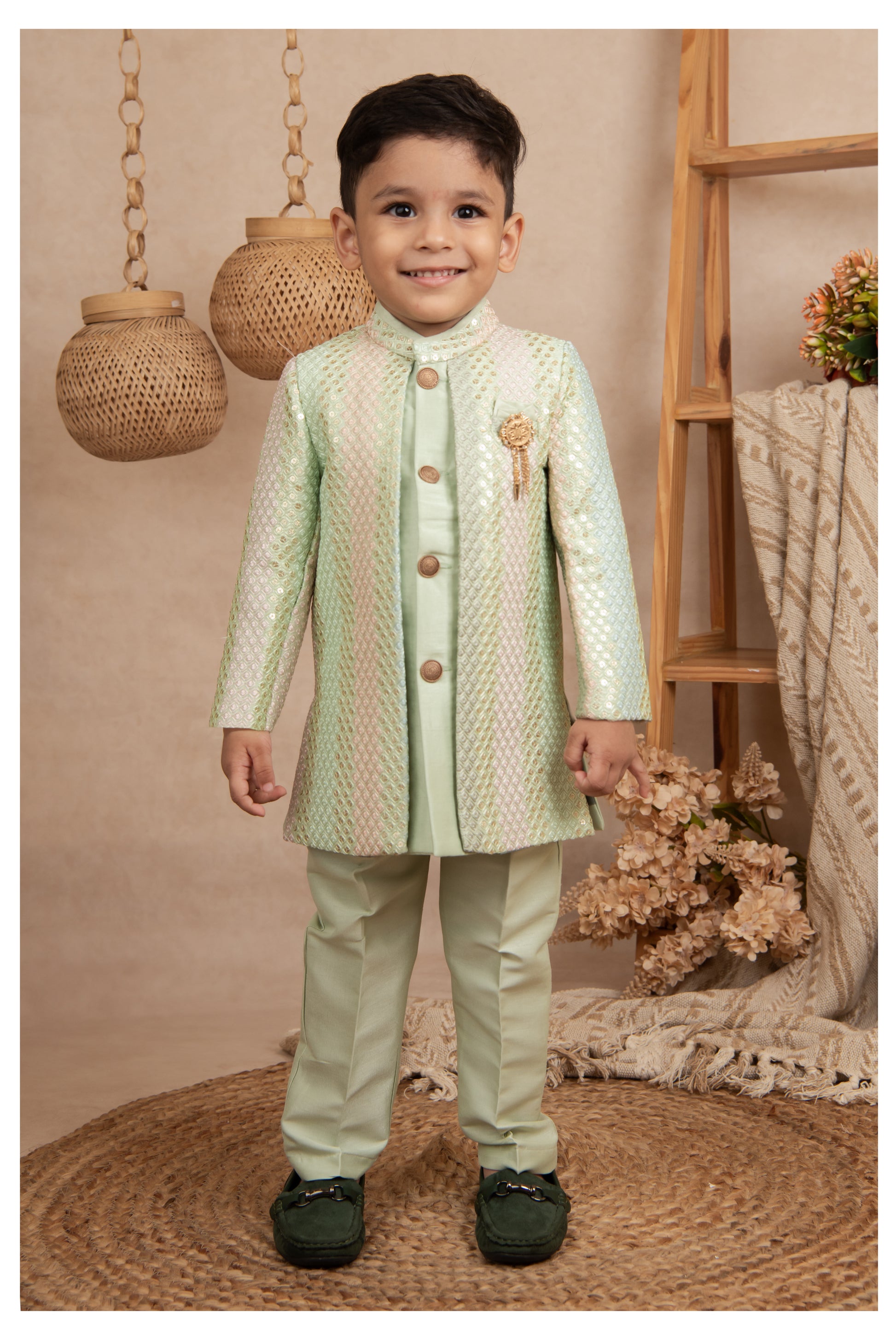 This LITTLE COLLARS fashion-forward silhouette is timeless and aesthetically beautiful. An ideal piece for all Rakhi/Diwali/Ramadan/Indian parties and weddings! Elegant Achkan has beautiful Sequin & Embellished  & Abstract Embroidered is paired with Pyjama set. This set is a perfect combination of opulence with comfort.