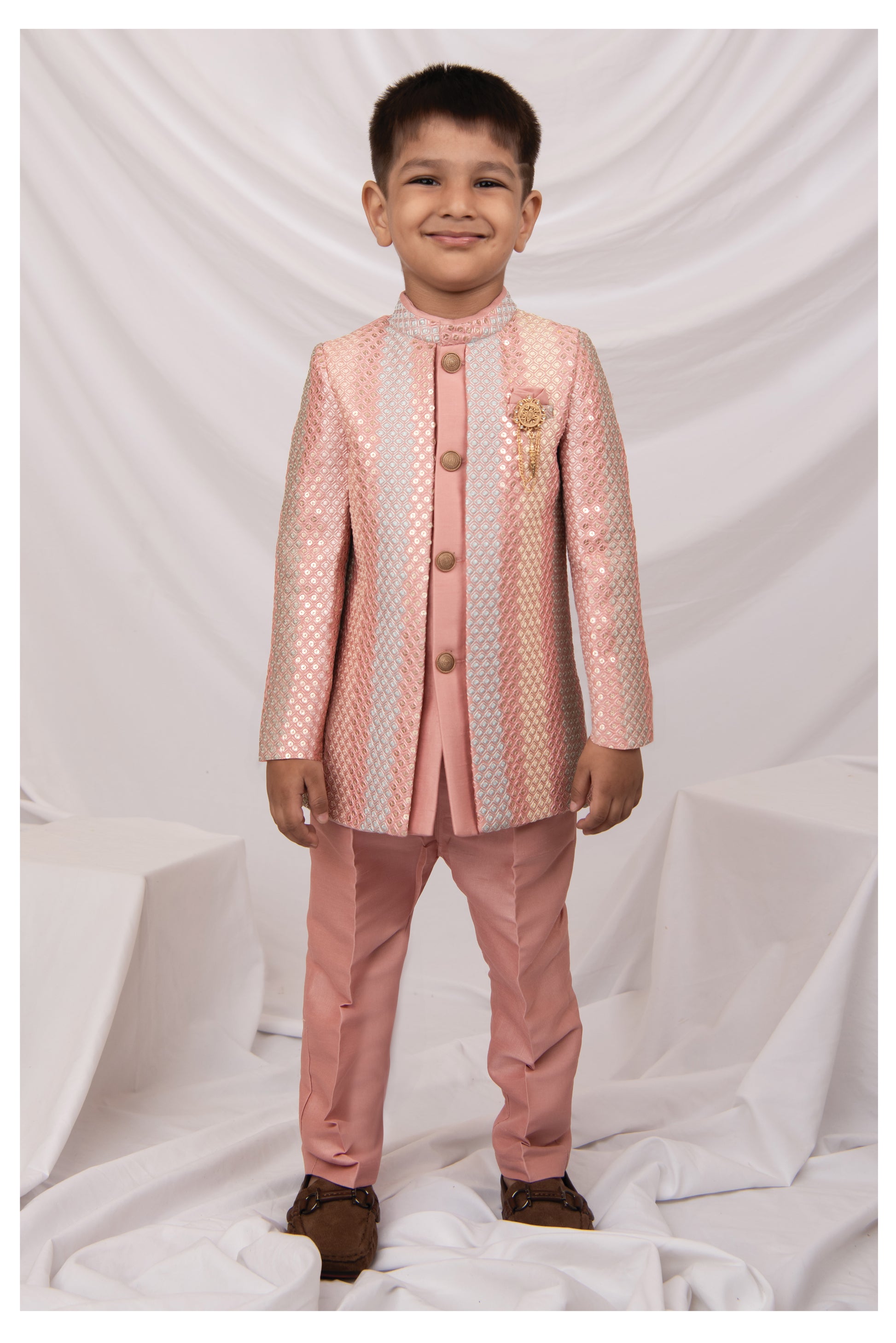 This LITTLE COLLARS fashion-forward silhouette is timeless and aesthetically beautiful. An ideal piece for all Rakhi/Diwali/Ramadan/Indian parties and weddings! Elegant Achkan has beautiful Sequin & Embellished  & Abstract Embroidered is paired with Pyjama set. This set is a perfect combination of opulence with comfort.