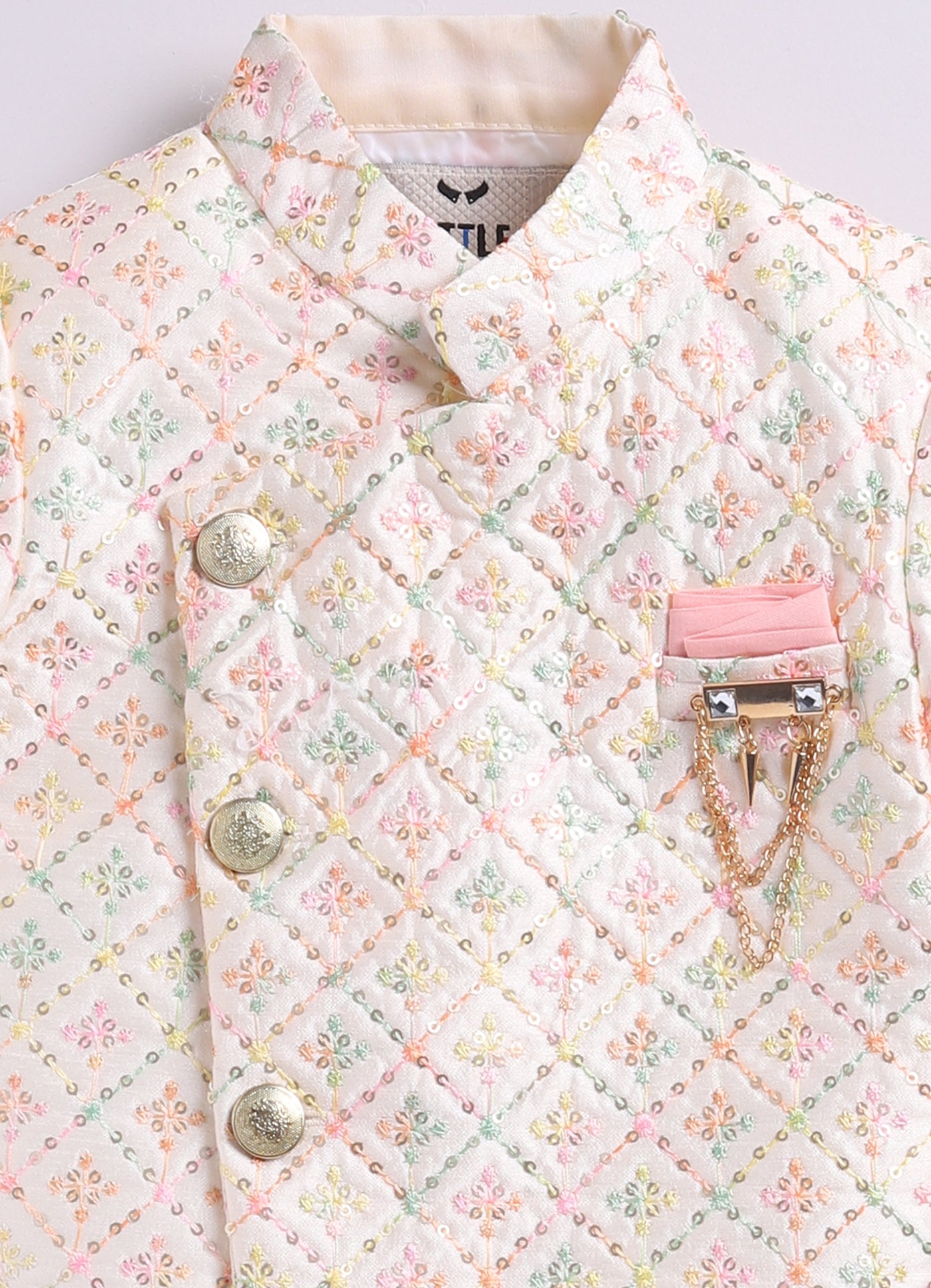 This LITTLE COLLARS fashion-forward silhouette is timeless and aesthetically beautiful. An ideal piece for all Rakhi/Diwali/Ramadan/Indian parties and weddings! Elegant Achkan has beautiful Sequin & Embellished & Abstract Embroidered is paired with Pajama set. This set is a perfect combination of opulence with comfort.