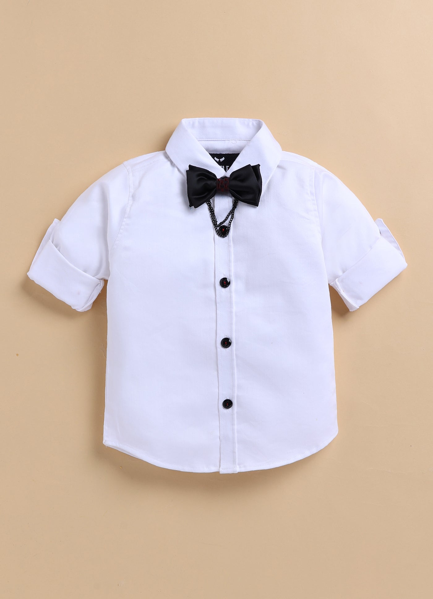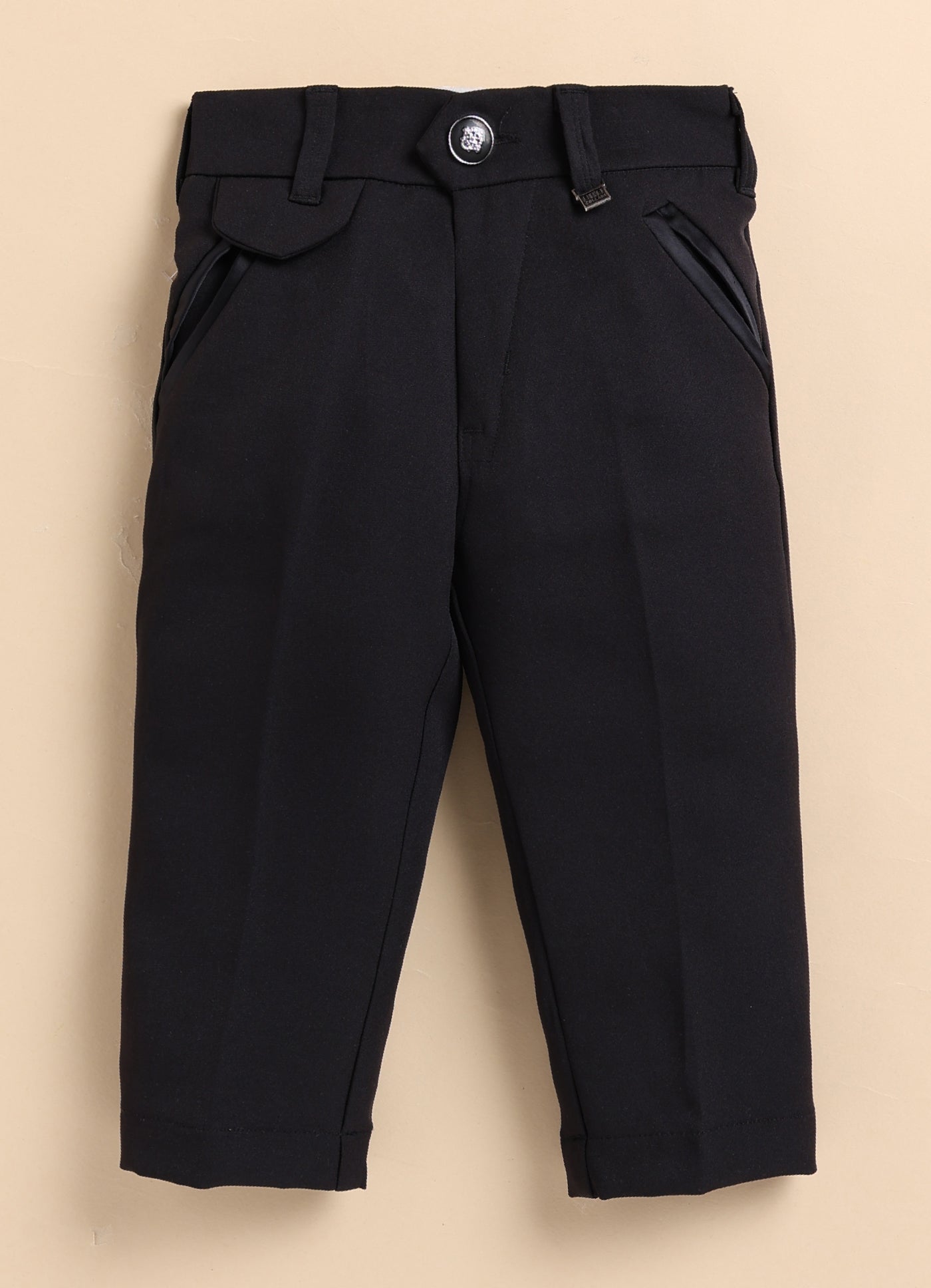 This stylish and cozy outfit features  Self Design jacket with formal look. Full Sleeves solid shirt is comfortable. Formal pants with pocket accents for a rich and functional look. The bow is exquisite. Perfect for party yet fashionable birthday wear/ outer wear look!