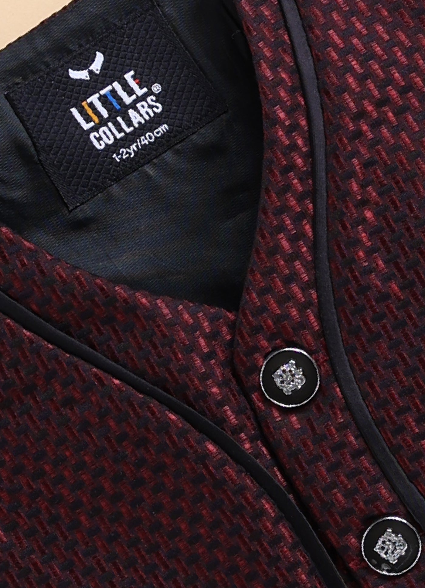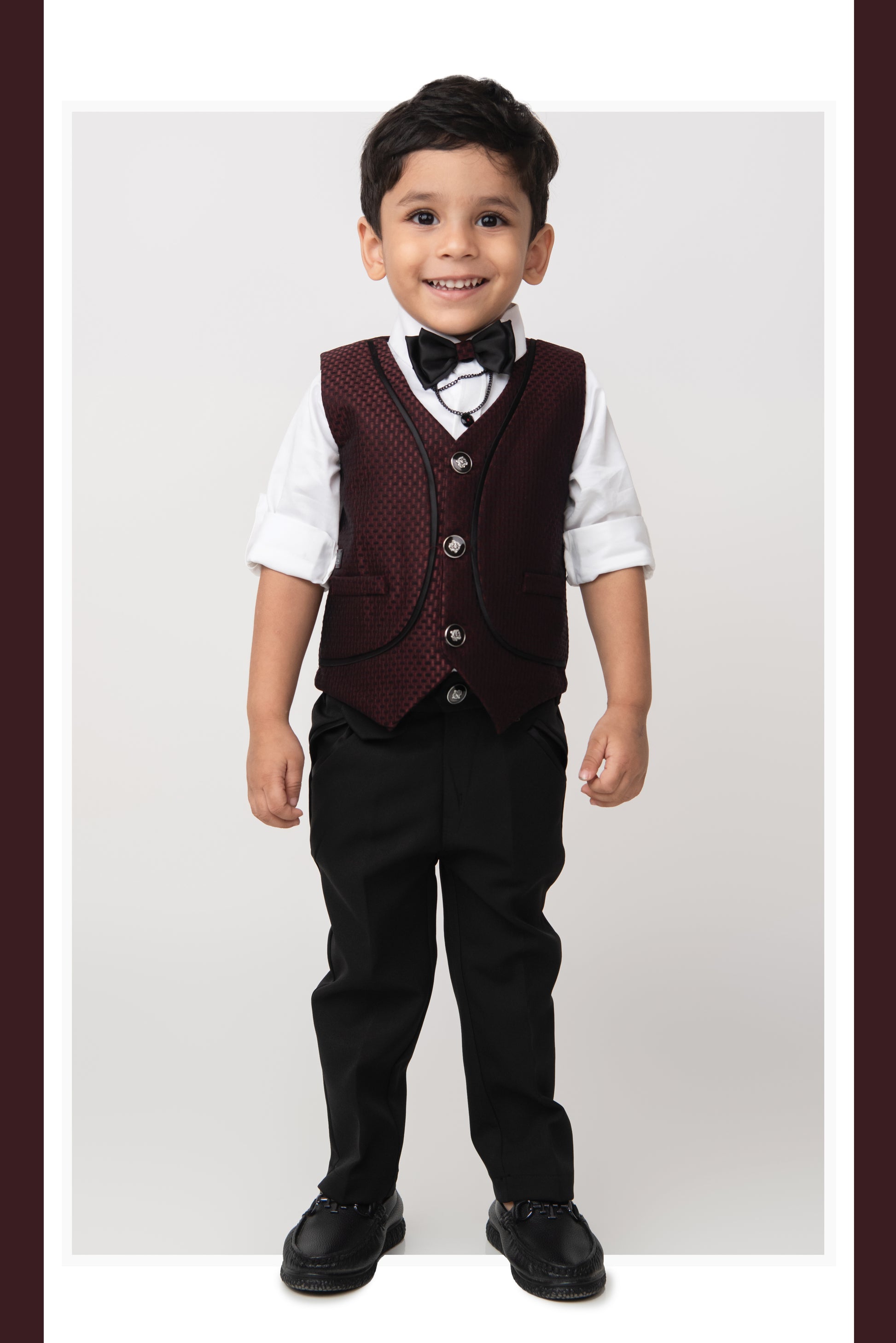 Blended Woven Full Sleeves Jaquard Waistcoat Pant with Shirt & Bow Partywear Set- Maroon