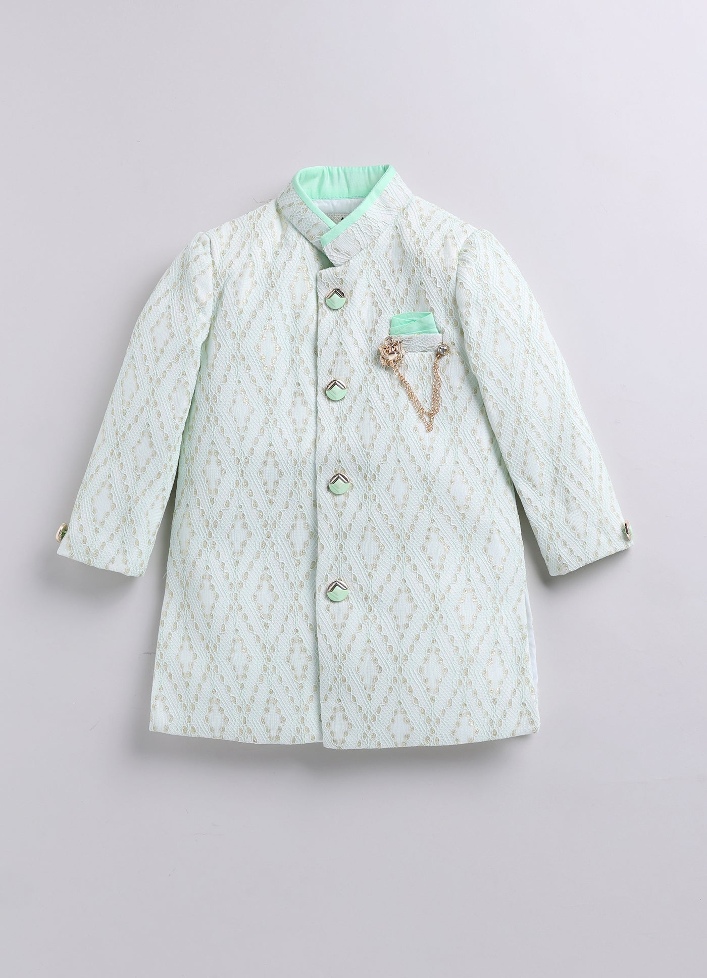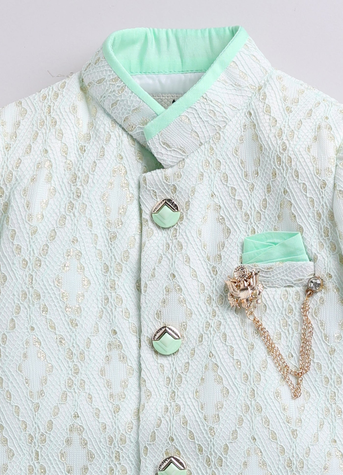 Blended Woven Full Sleeves Zari Work Embellished & Abstract Embroidered Achkan With Dhoti Pant and Brooch Ethnic Set - Green