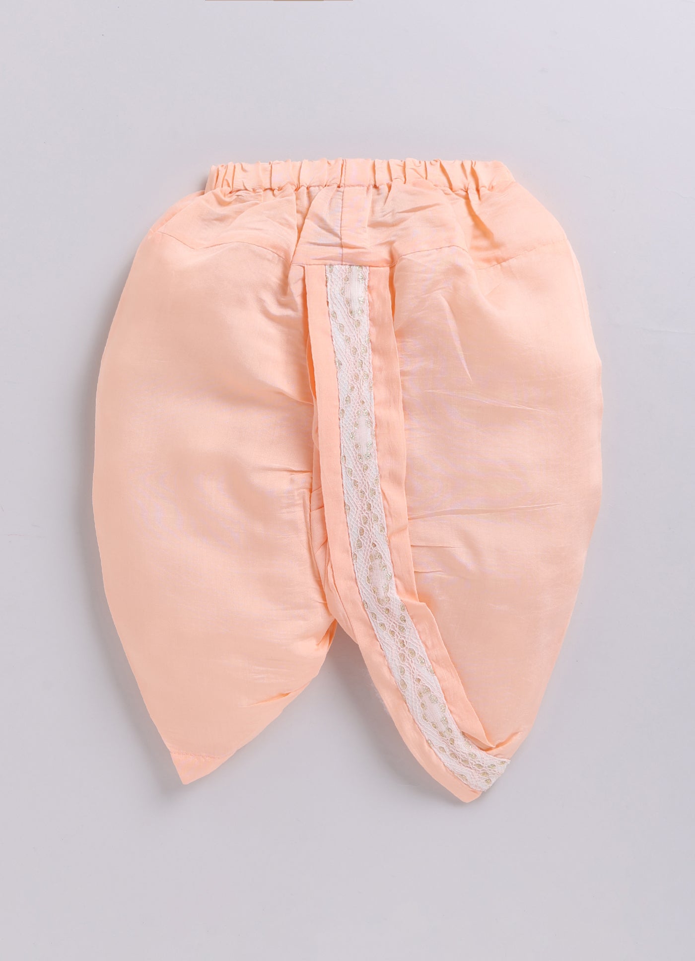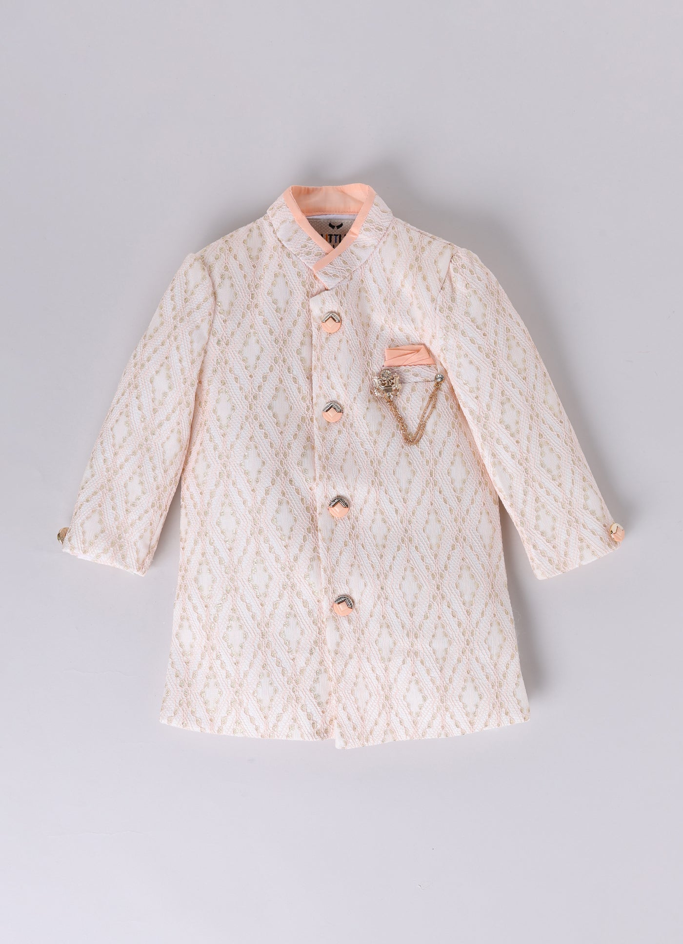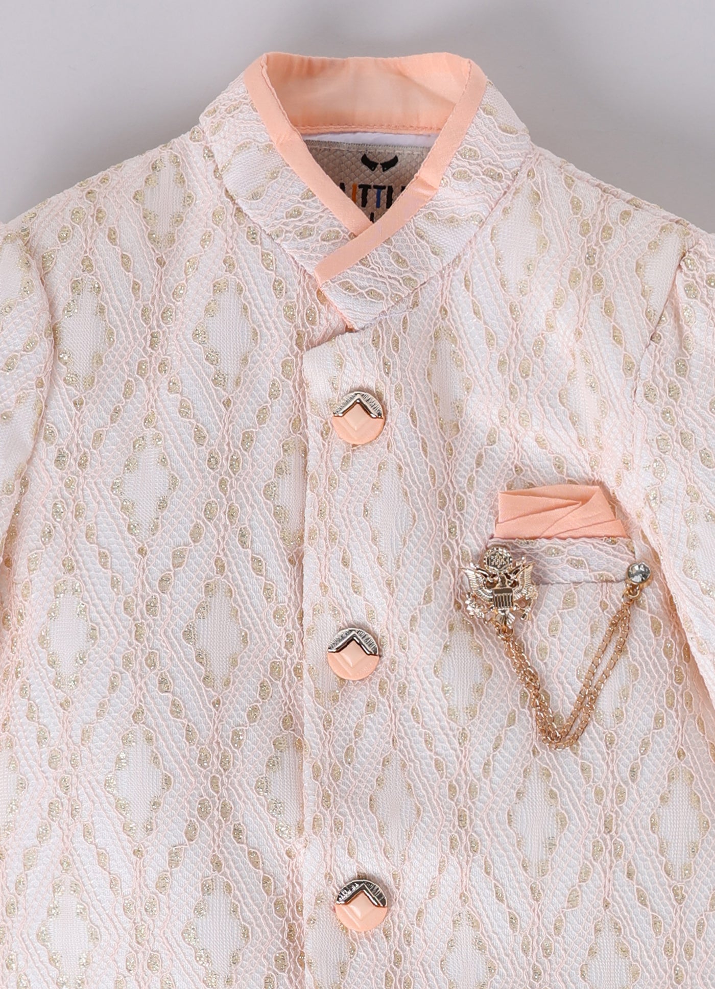 Blended Woven Full Sleeves Zari Work Embellished & Abstract Embroidered Achkan With Dhoti Pant and Brooch Ethnic Set - Peach