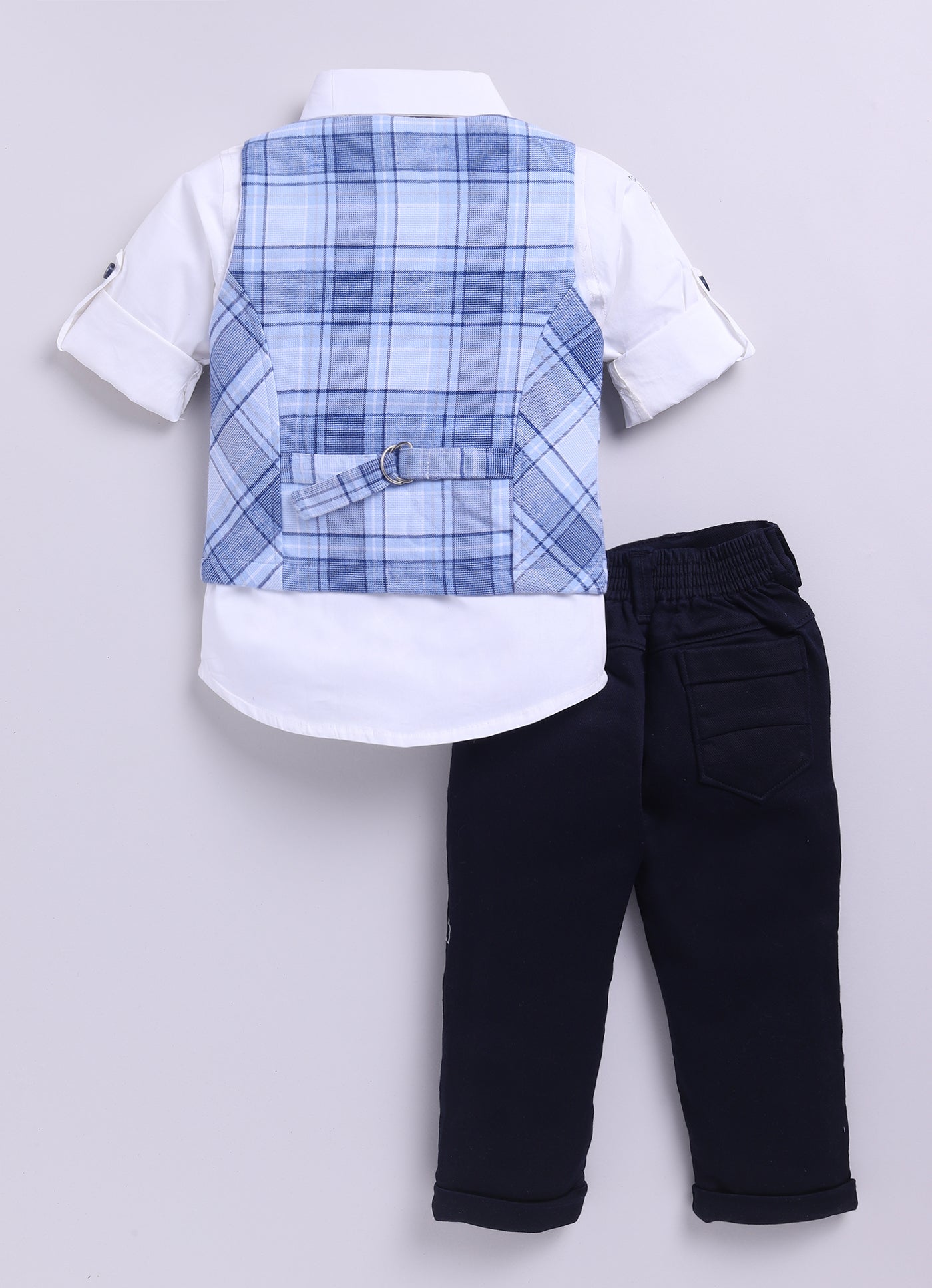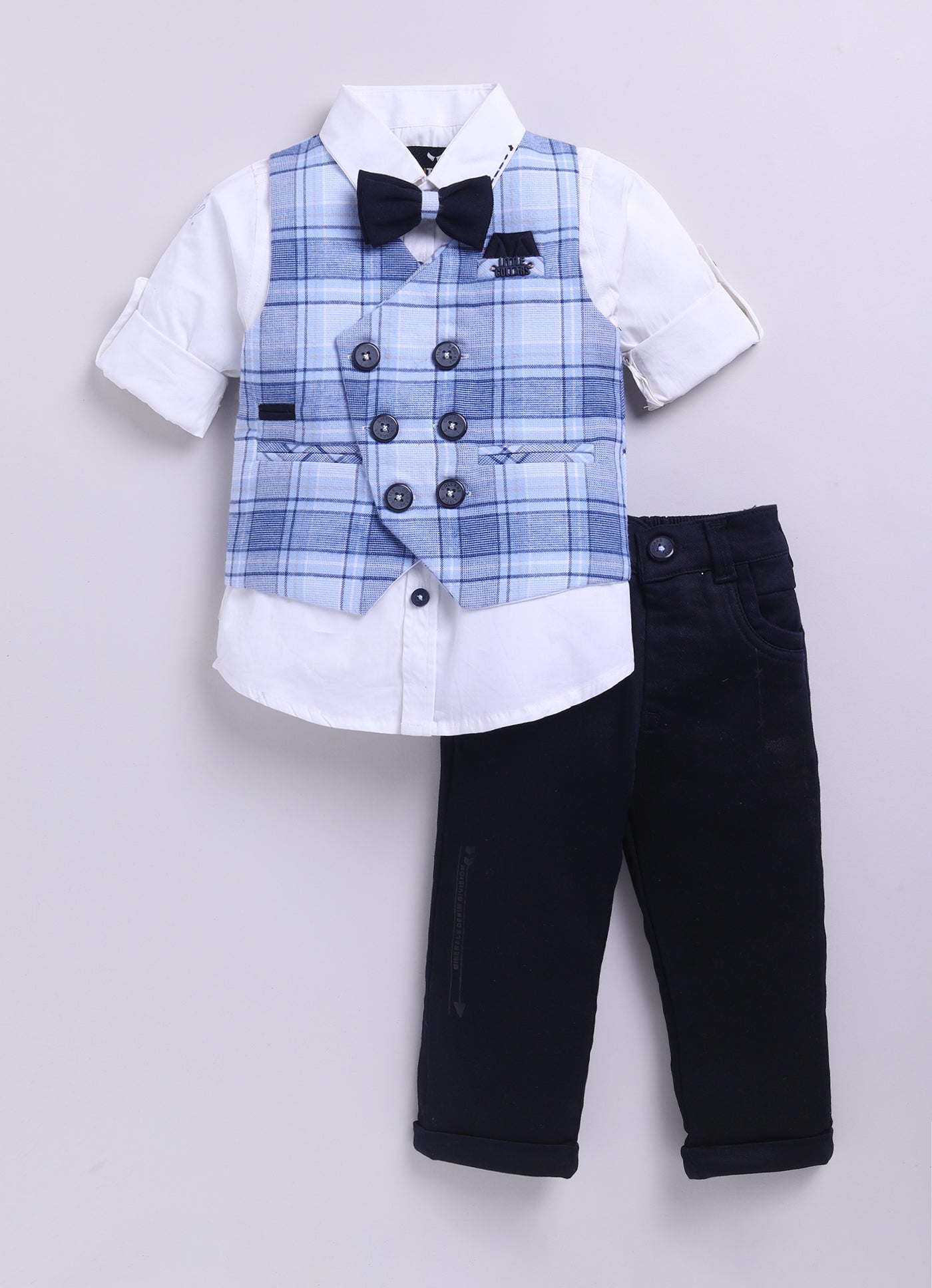 Blue Full Sleeves Solid Shirt Pant With Cotton Checkered Waistcoat Cap & Bow Set