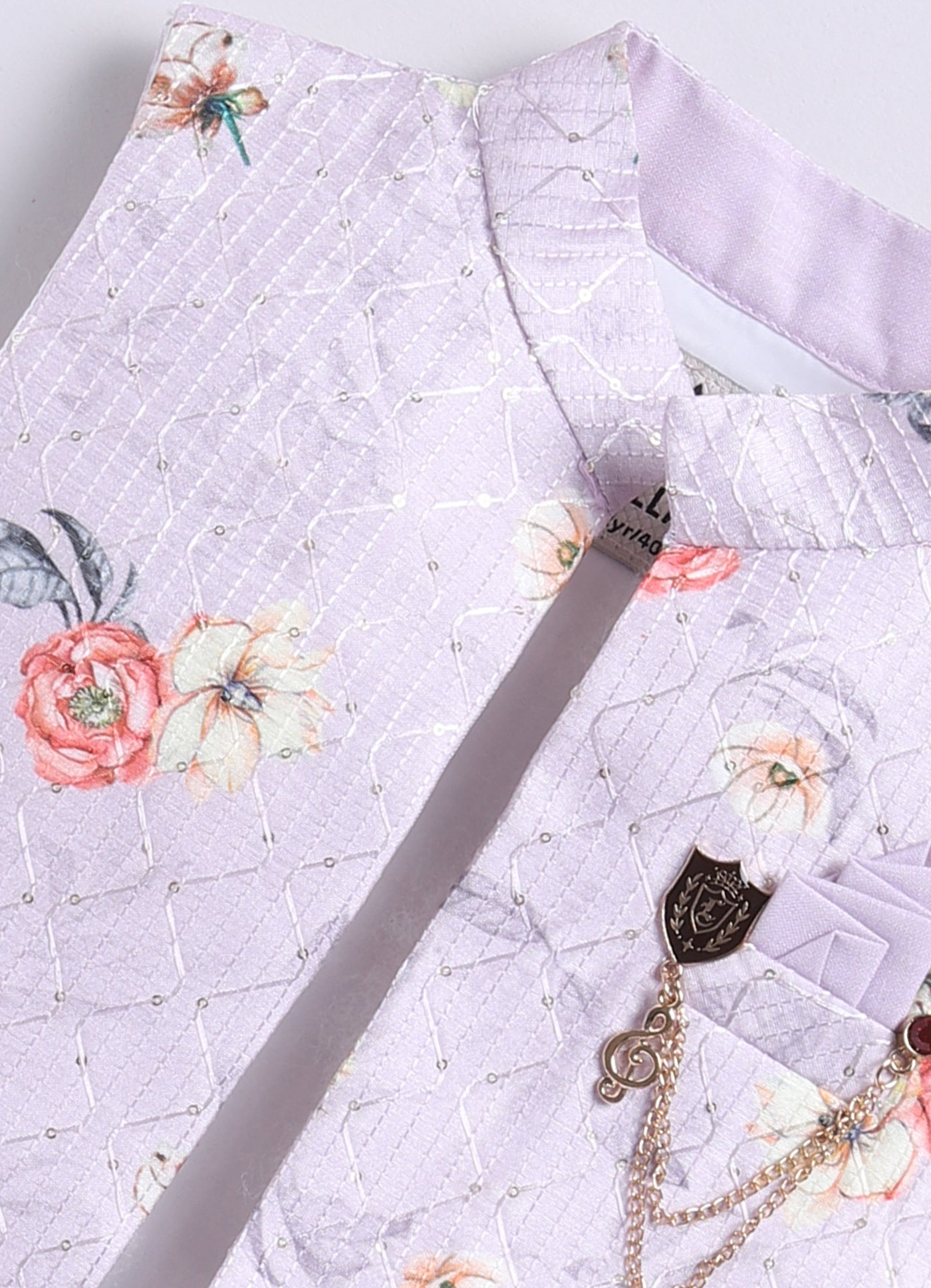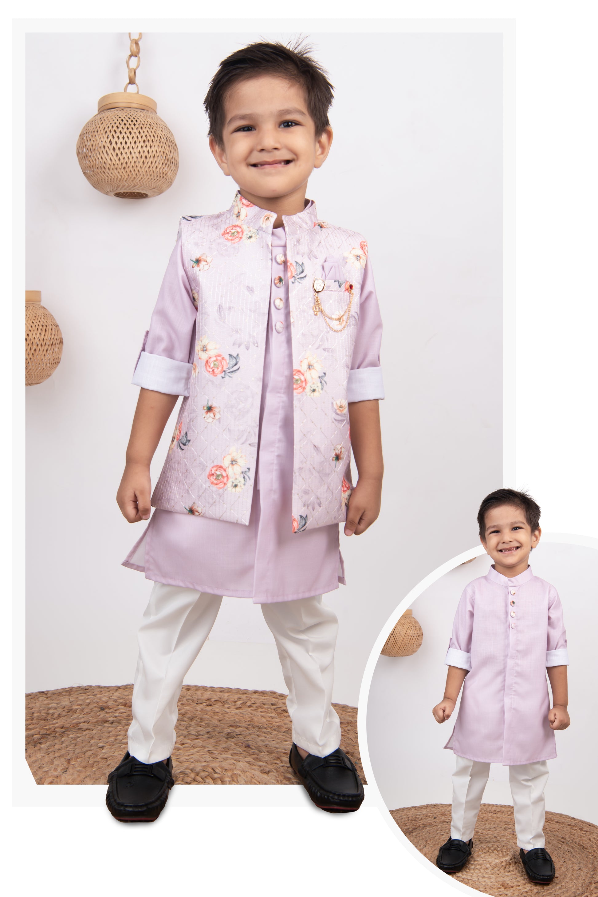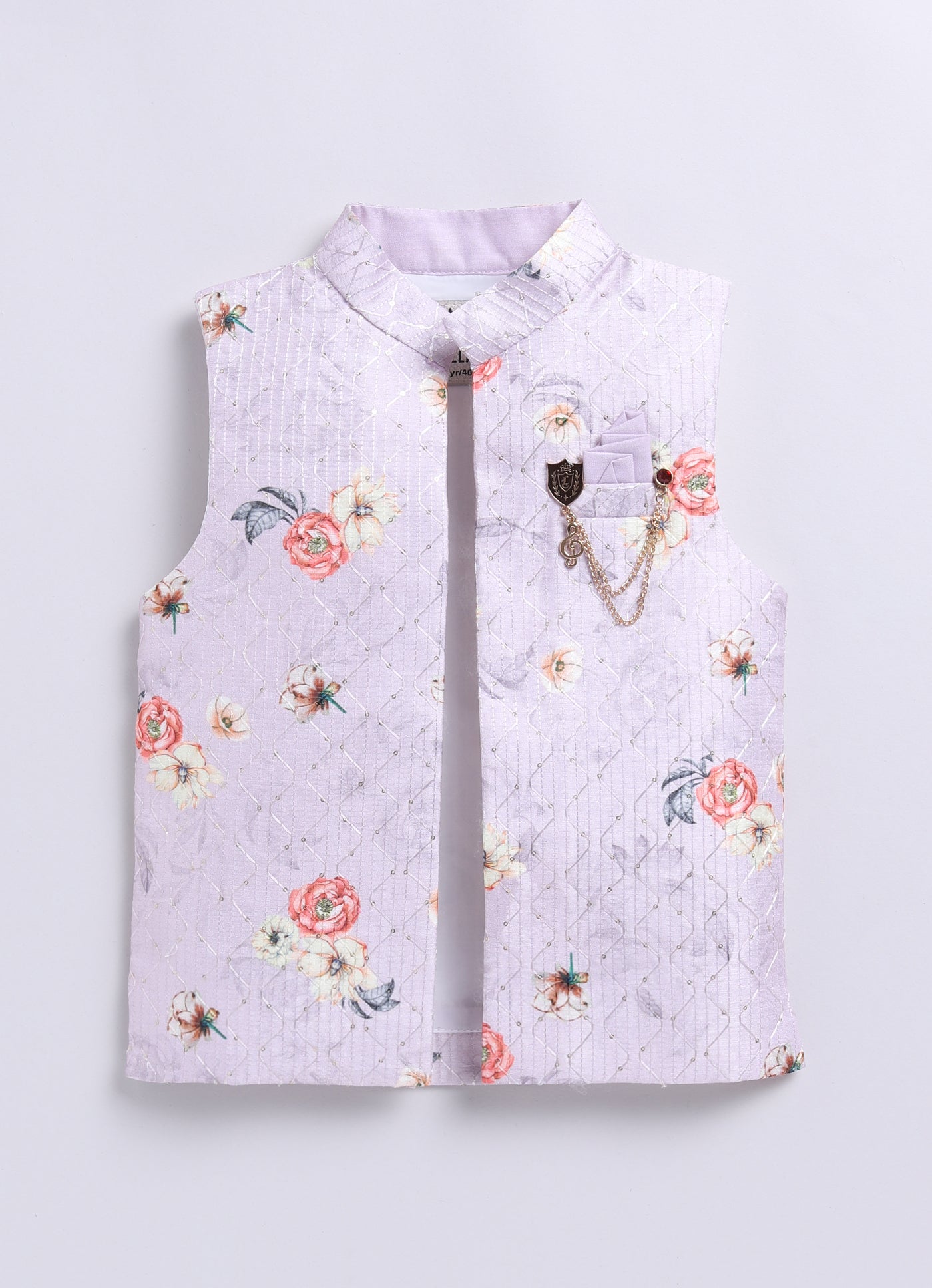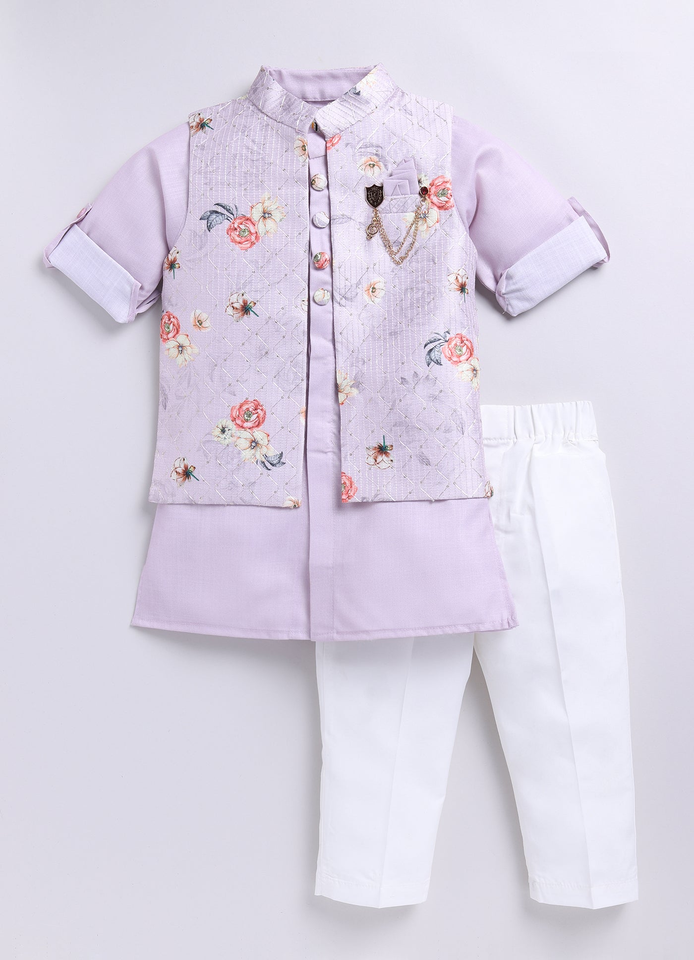 This Little Collars fashion-forward silhouette is timeless and aesthetically beautiful. An ideal piece for all Rakhi/Diwali/Ramadan/Indian parties and weddings! The floral embroidered jacket is paired with a kurta and pajama set. This set is a perfect combination of opulence with comfort. The set can be worn without the jacket also.The ornamental gold lapel pin on the pocket square looks quirky yet subtle.