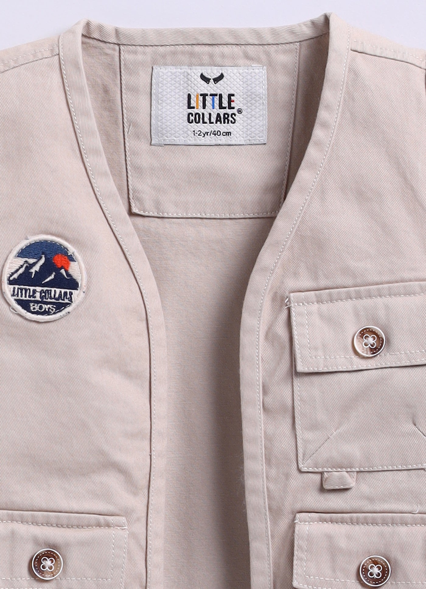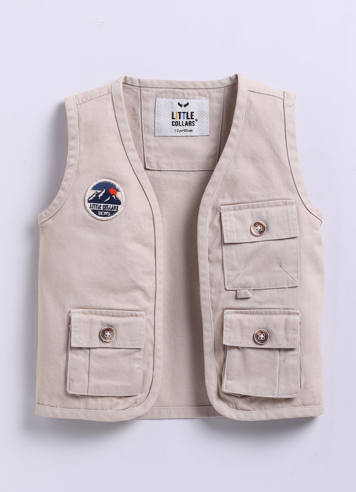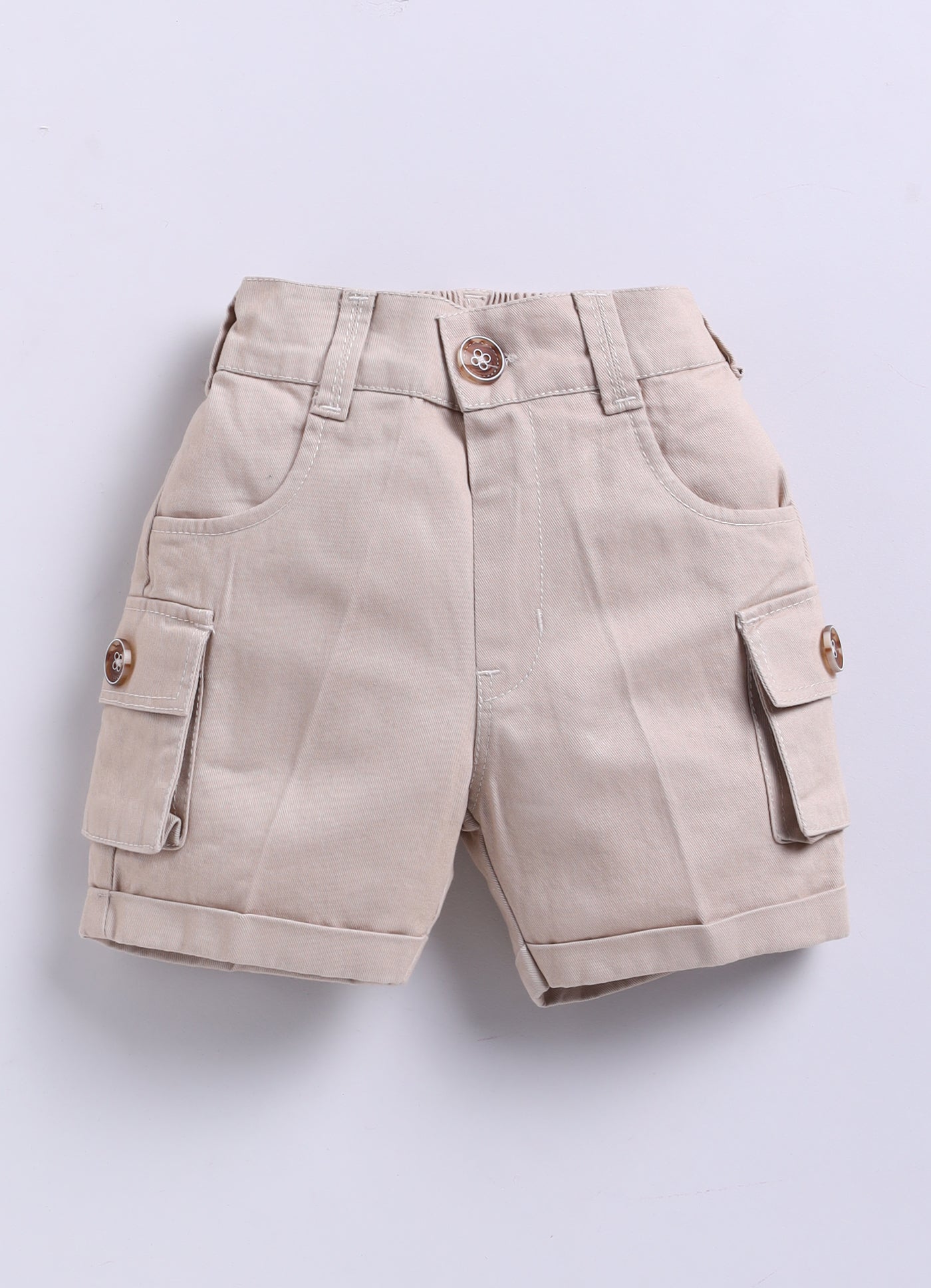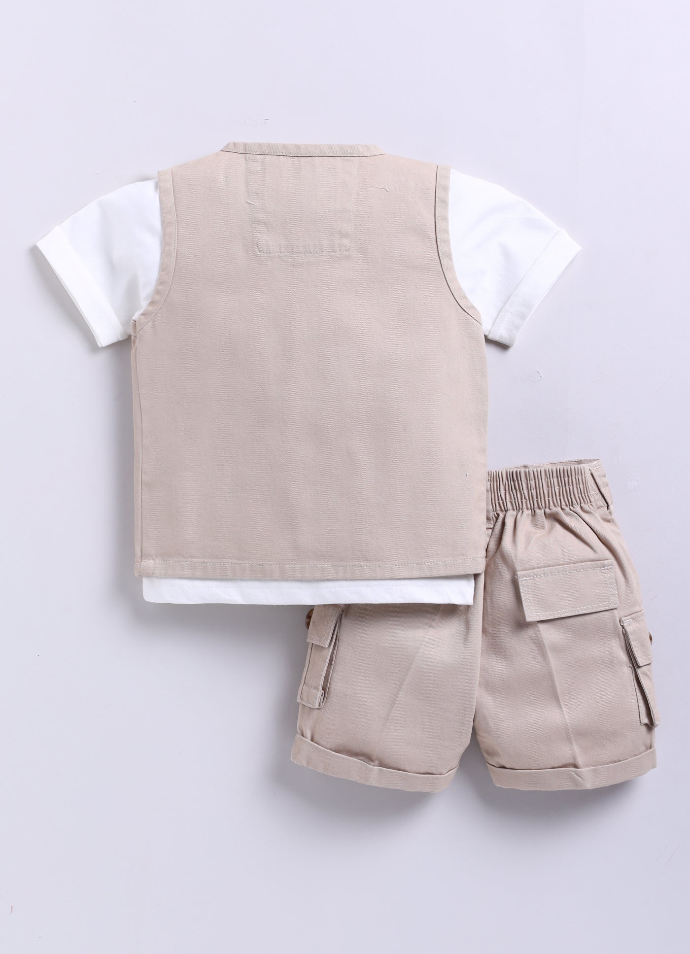 Casual Cotton Multi Pocket Cargo Sleeveless Gilet Jacket Half Sleeves Tshirt Half Pant Co-ord Set - Beige