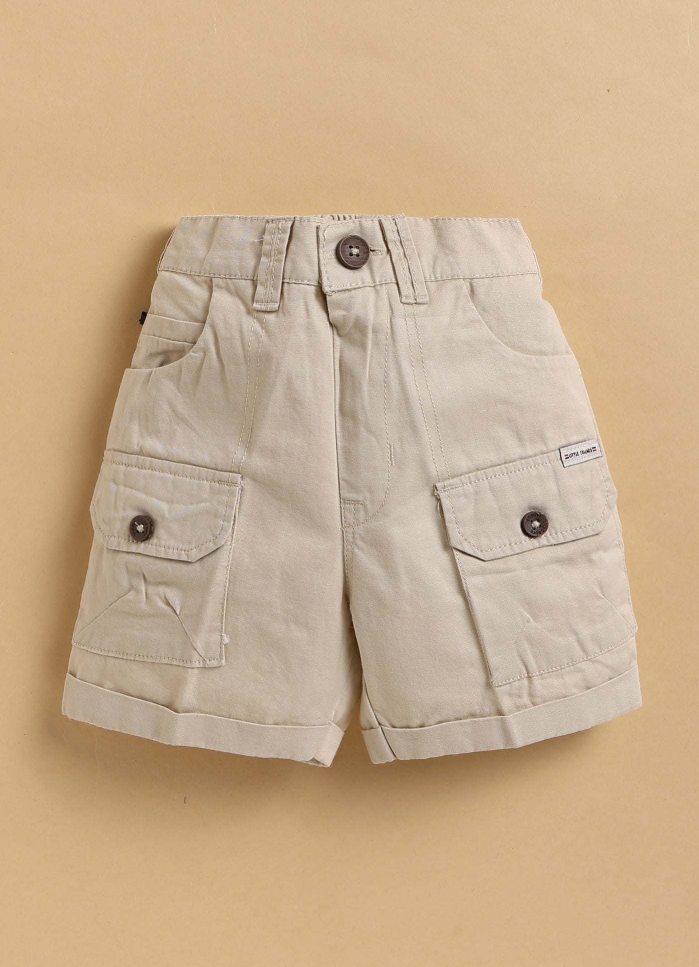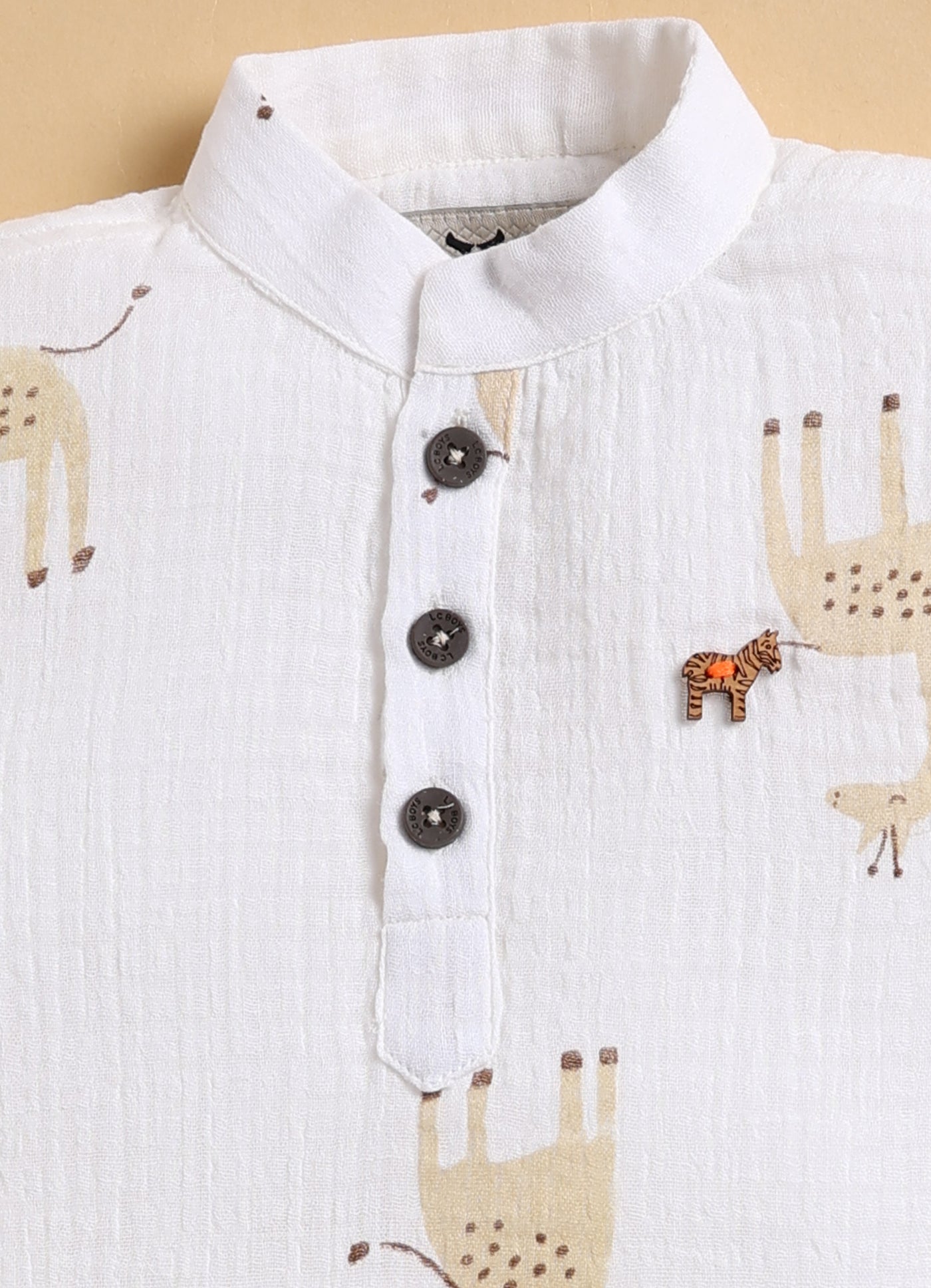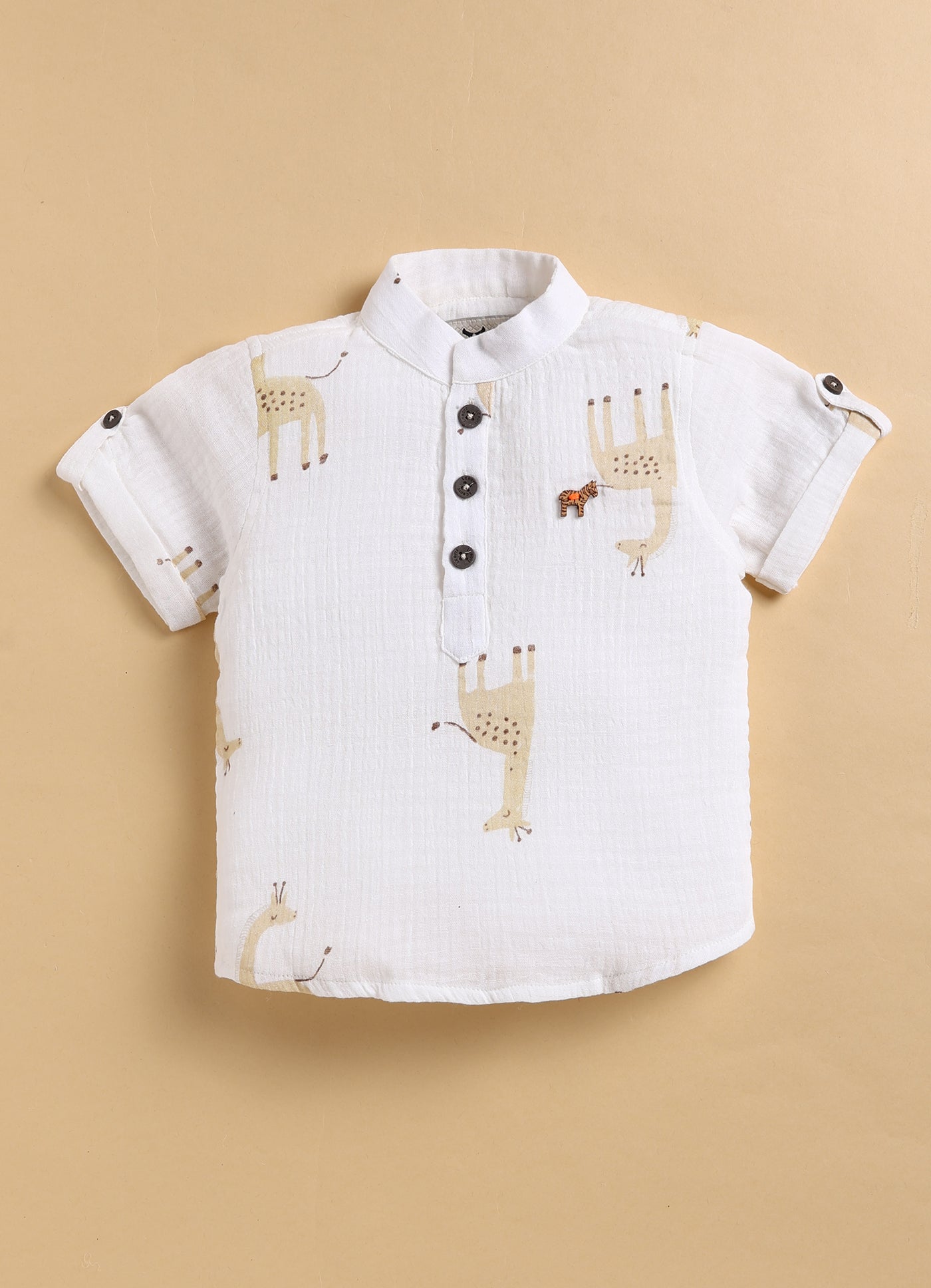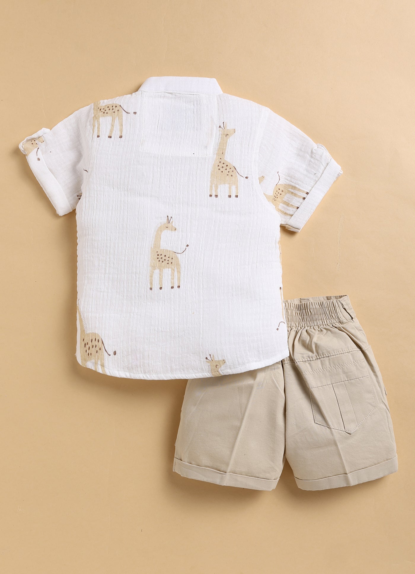 Casual Pure Organic Muslin Cotton Giraffe Printed Half Sleeves Mandarin Collar Kurta Shirt Half Pant Set - Beige