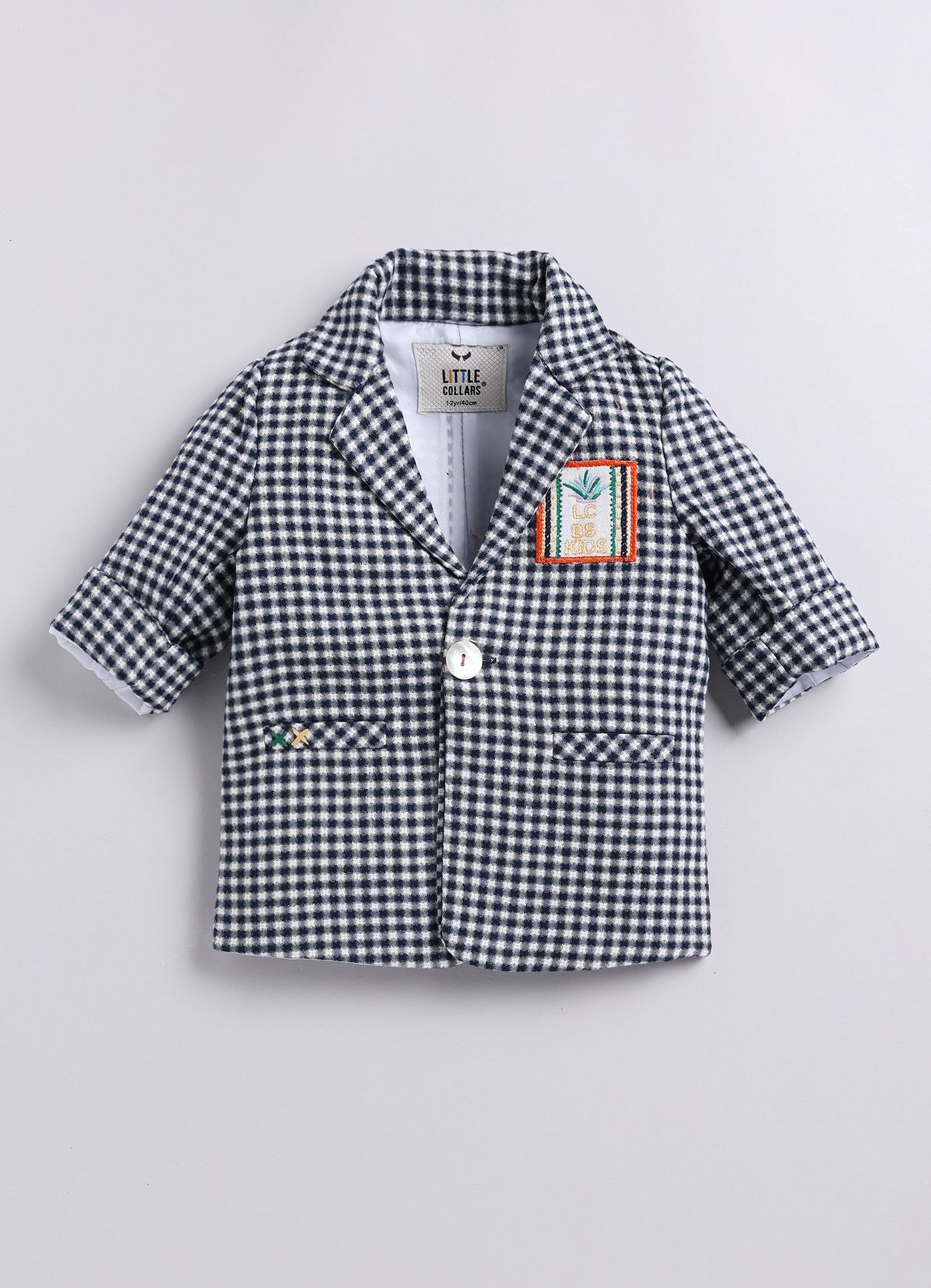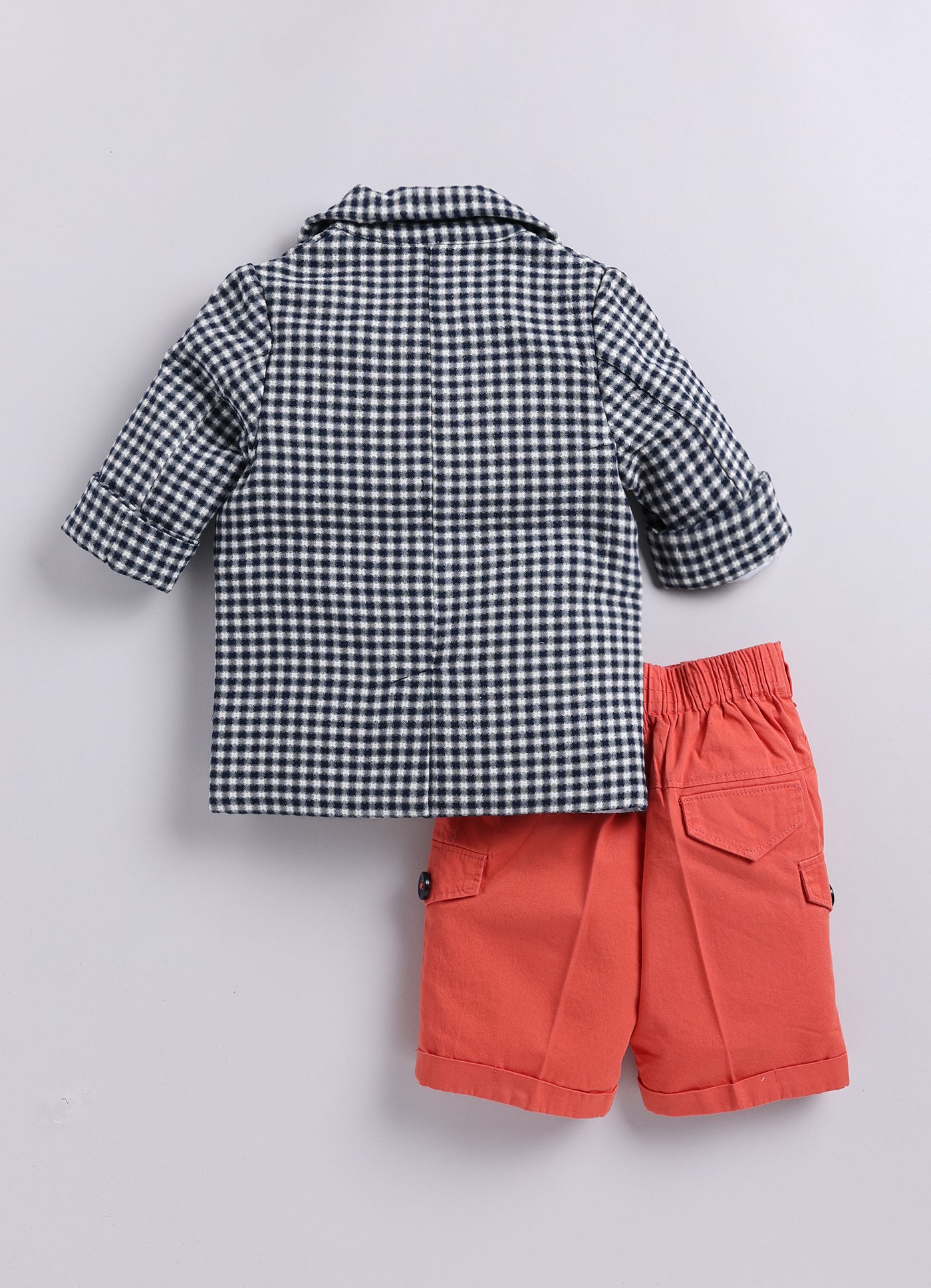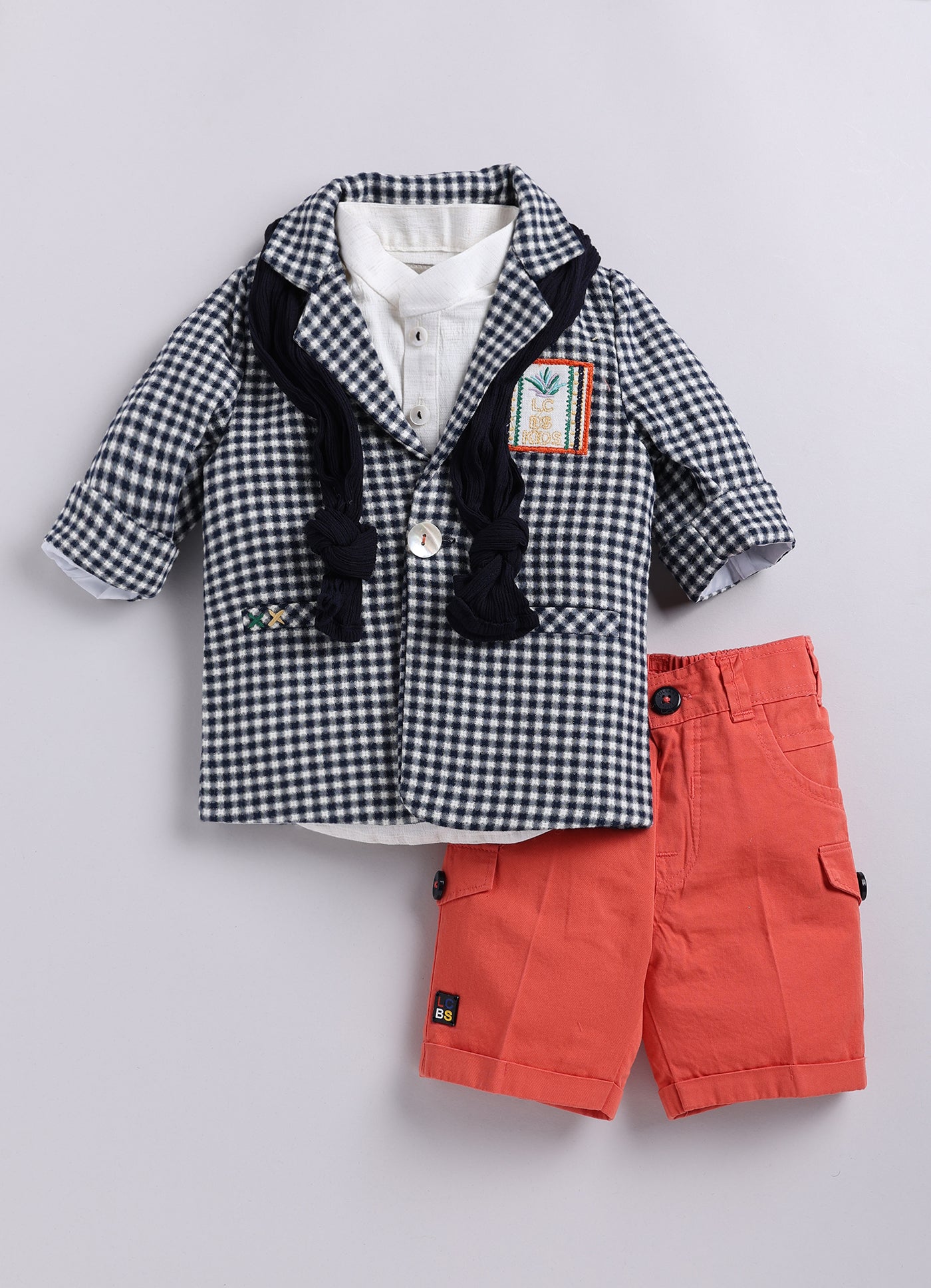 A stylish and adorable baby boy's outfit, perfect for special occasions or a dapper day out. A checkered blazer features a classic pattern and has a muffler/stole which can be worn around the neck. The blazer also has a cute patch on one side adding a playful touch. The vibrant cargo shorts add a pop of color and a casual element to the outfit.