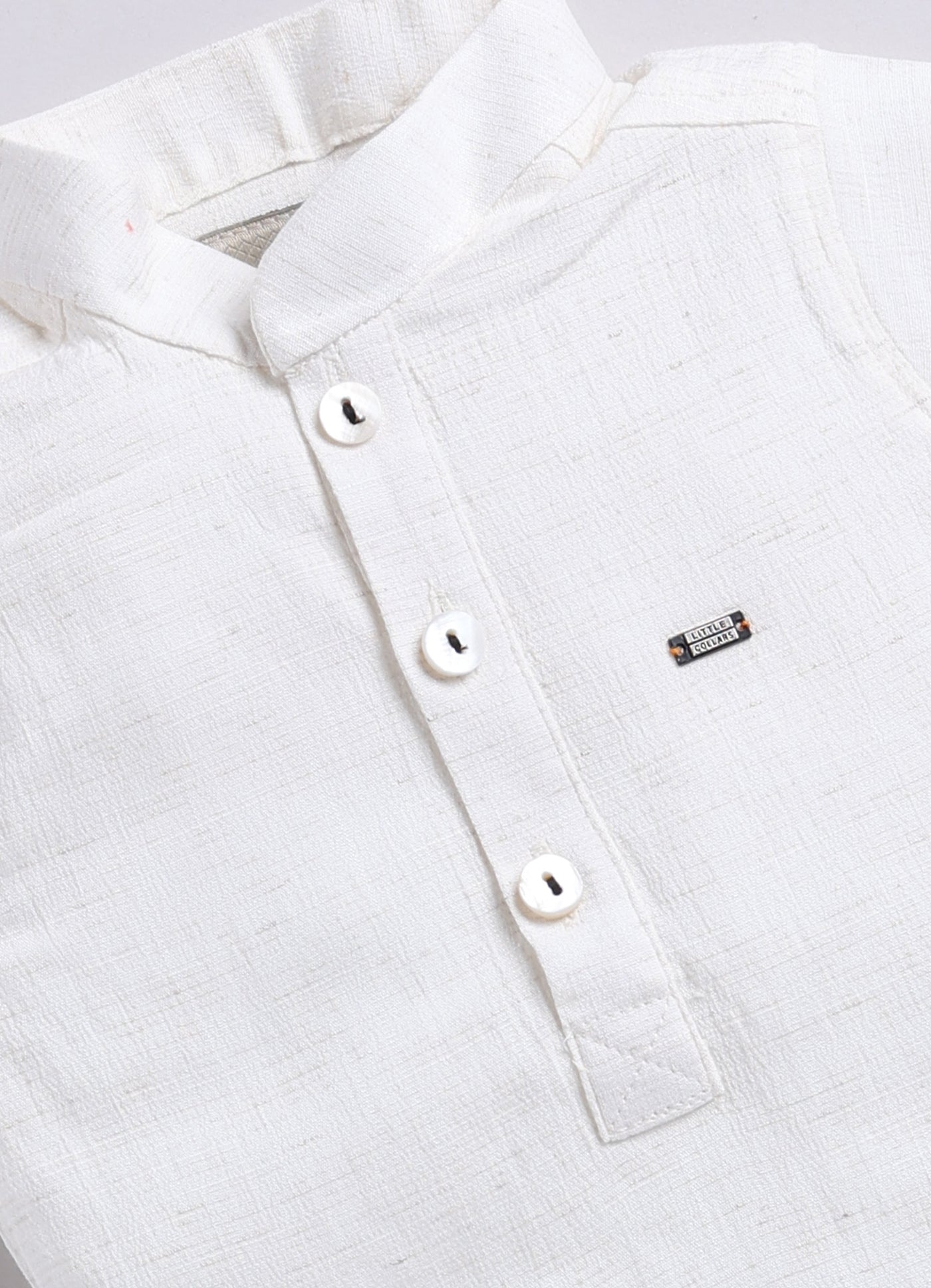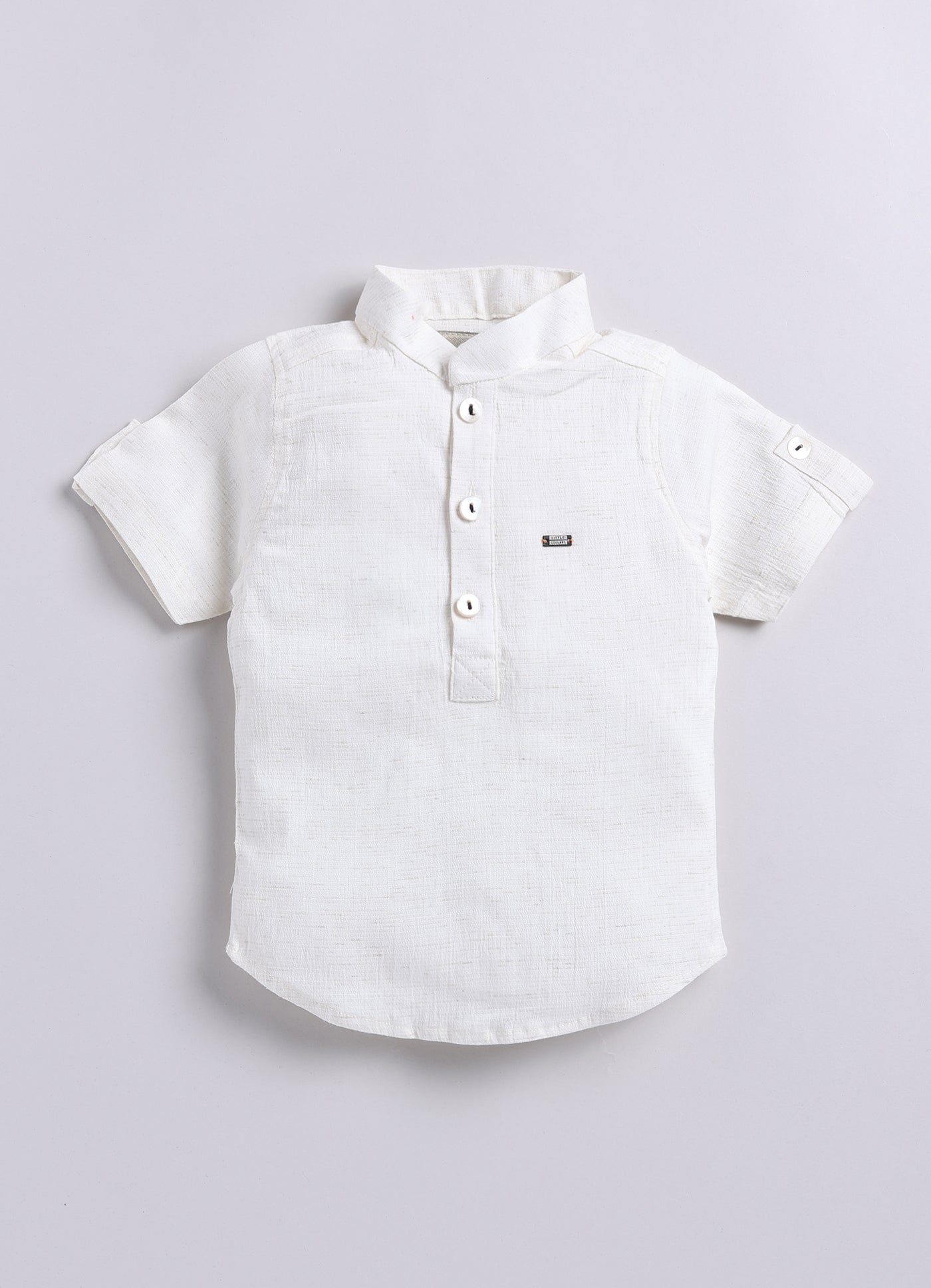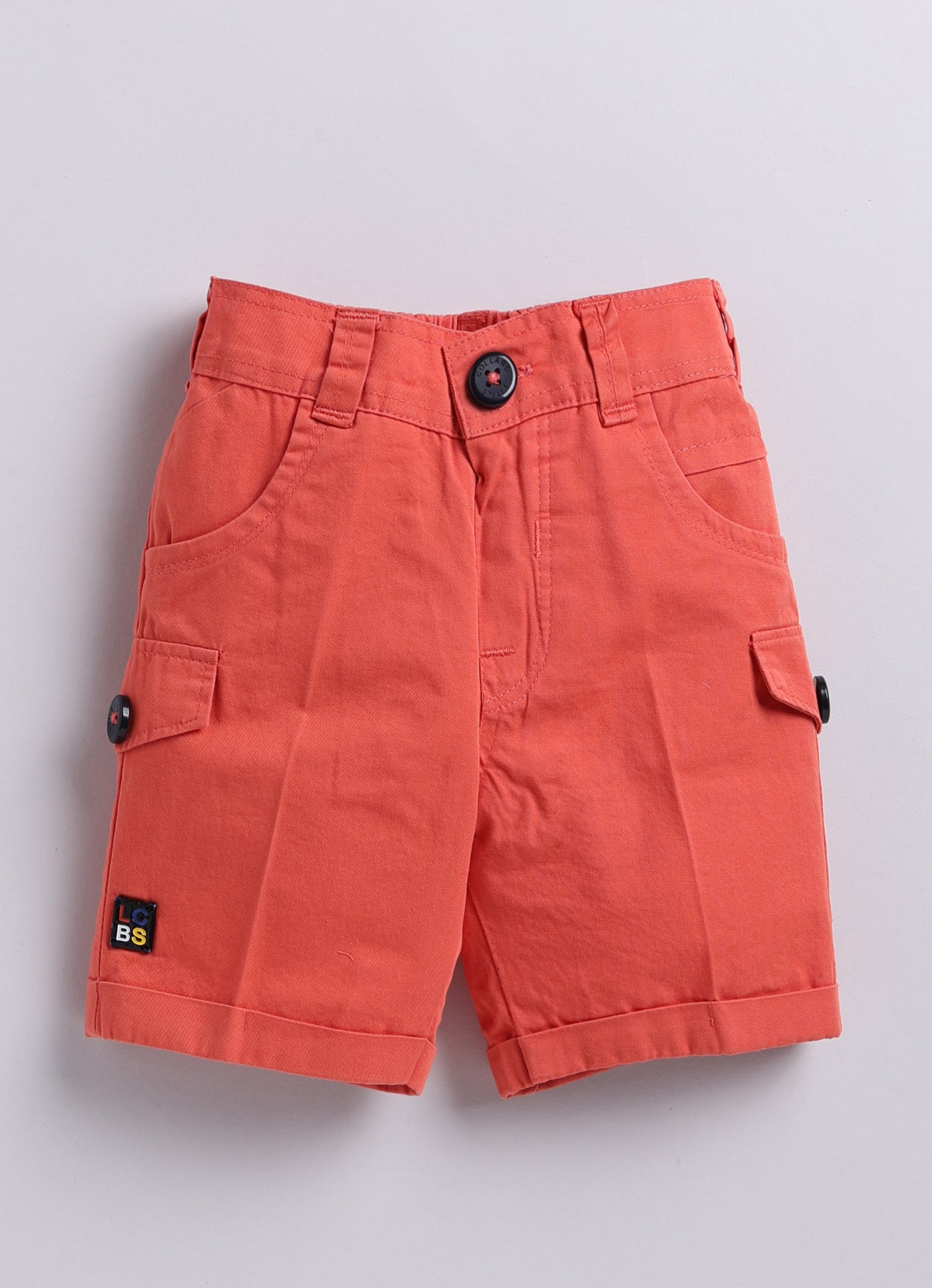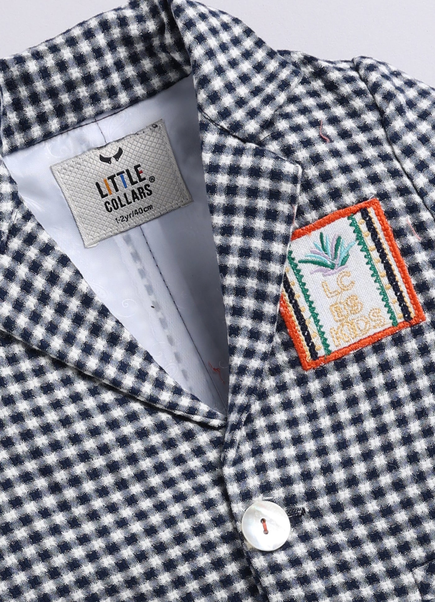 A stylish and adorable baby boy's outfit, perfect for special occasions or a dapper day out. A checkered blazer features a classic pattern and has a muffler/stole which can be worn around the neck. The blazer also has a cute patch on one side adding a playful touch. The vibrant cargo shorts add a pop of color and a casual element to the outfit.