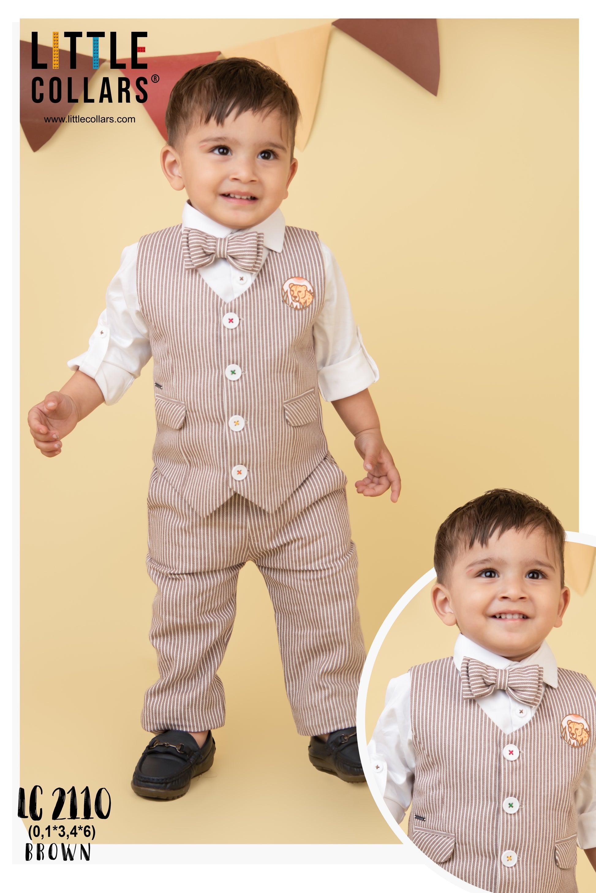 Cotton Woven Full Sleeves Striped Animal Logo Waistcoat Jacket Pant with Solid Shirt & Bow Coord Set- Brown
