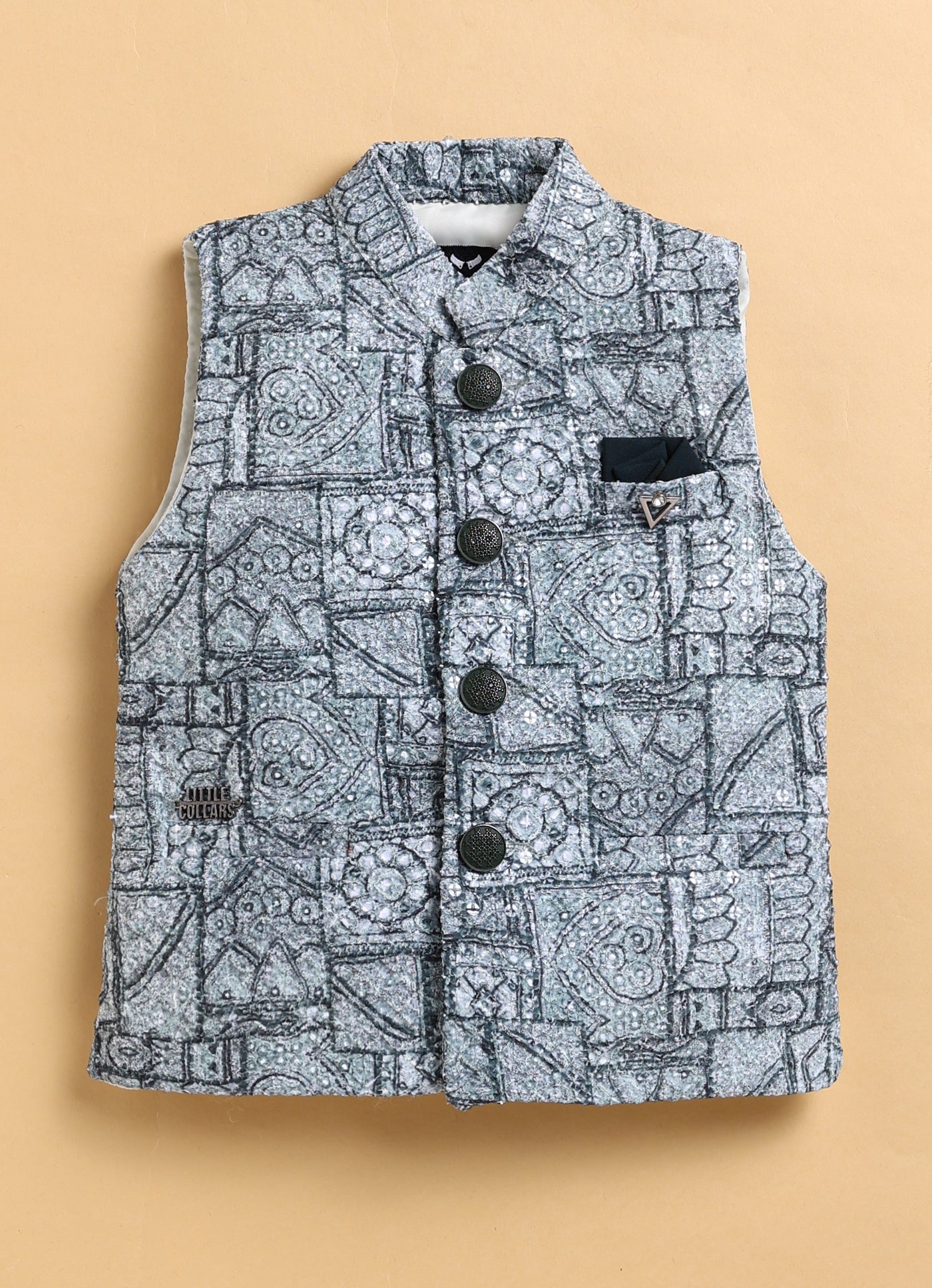 This outfit is perfect for festive occasions or special events. The combination of the print with embellished sequins gives a trendy and stylish look. The traditional elements like the Nehru Jacket are balanced with the modern fit of the pants, making it a versatile choice for any occasion. This set is adorned with beautiful metal buttons and broach pin.