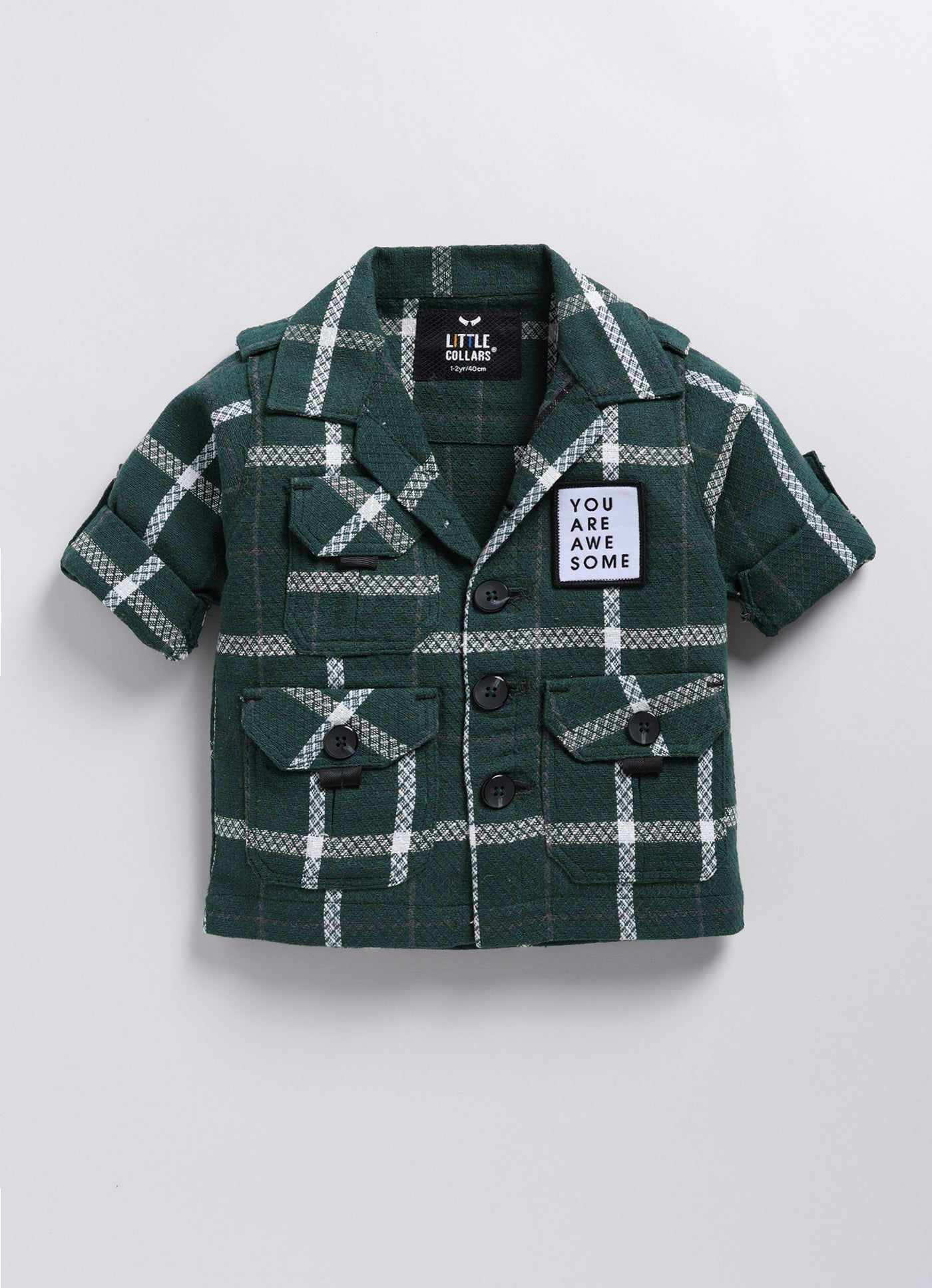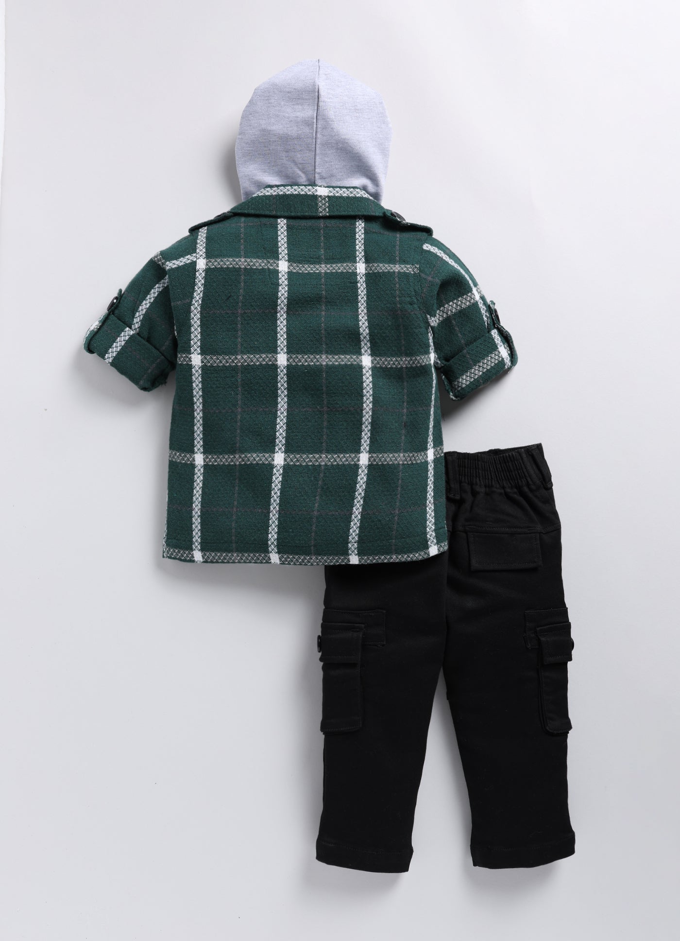Green Blue Cotton Checkered Casual Overshirt and Cargo Pants Set for Boys