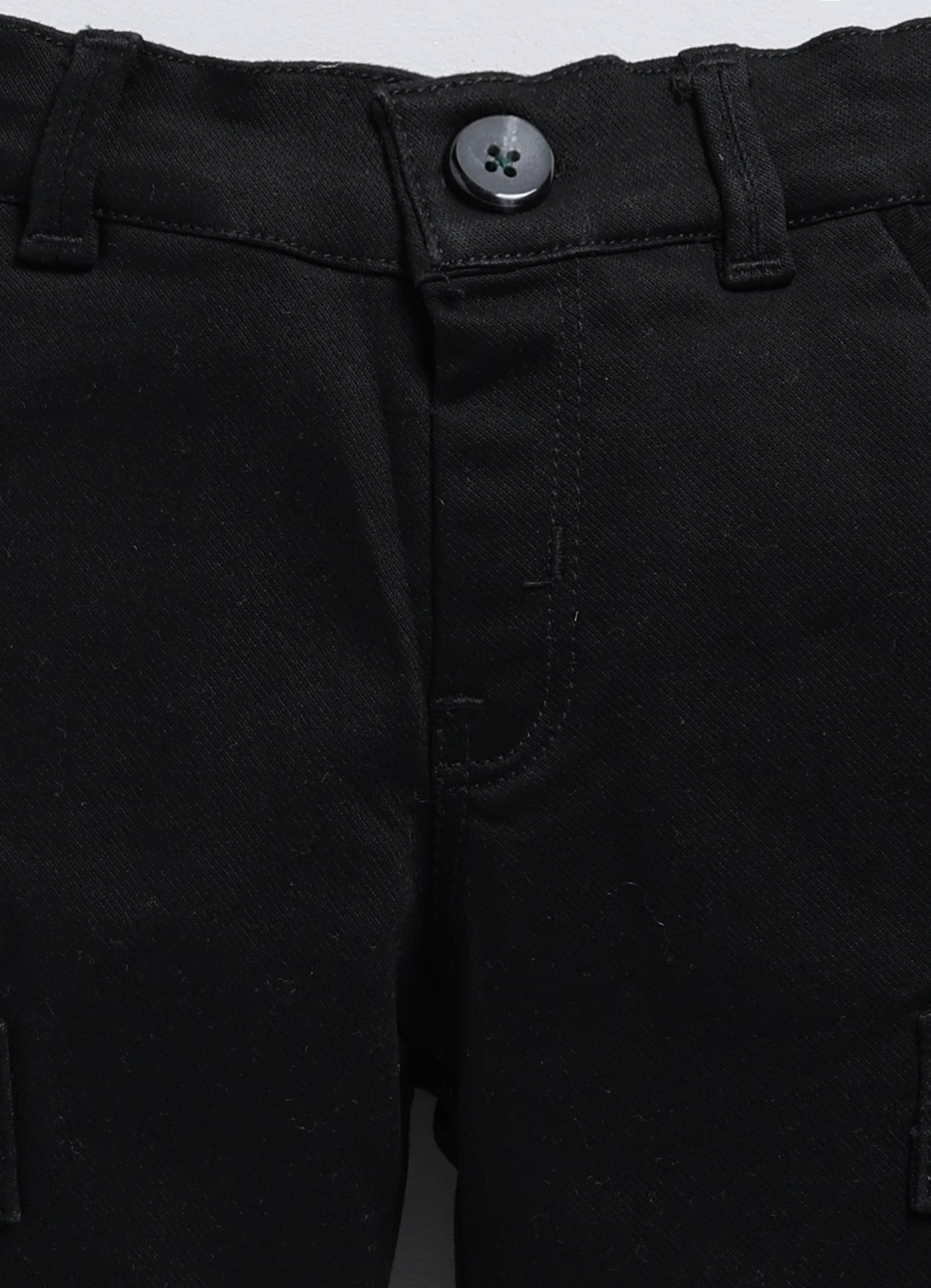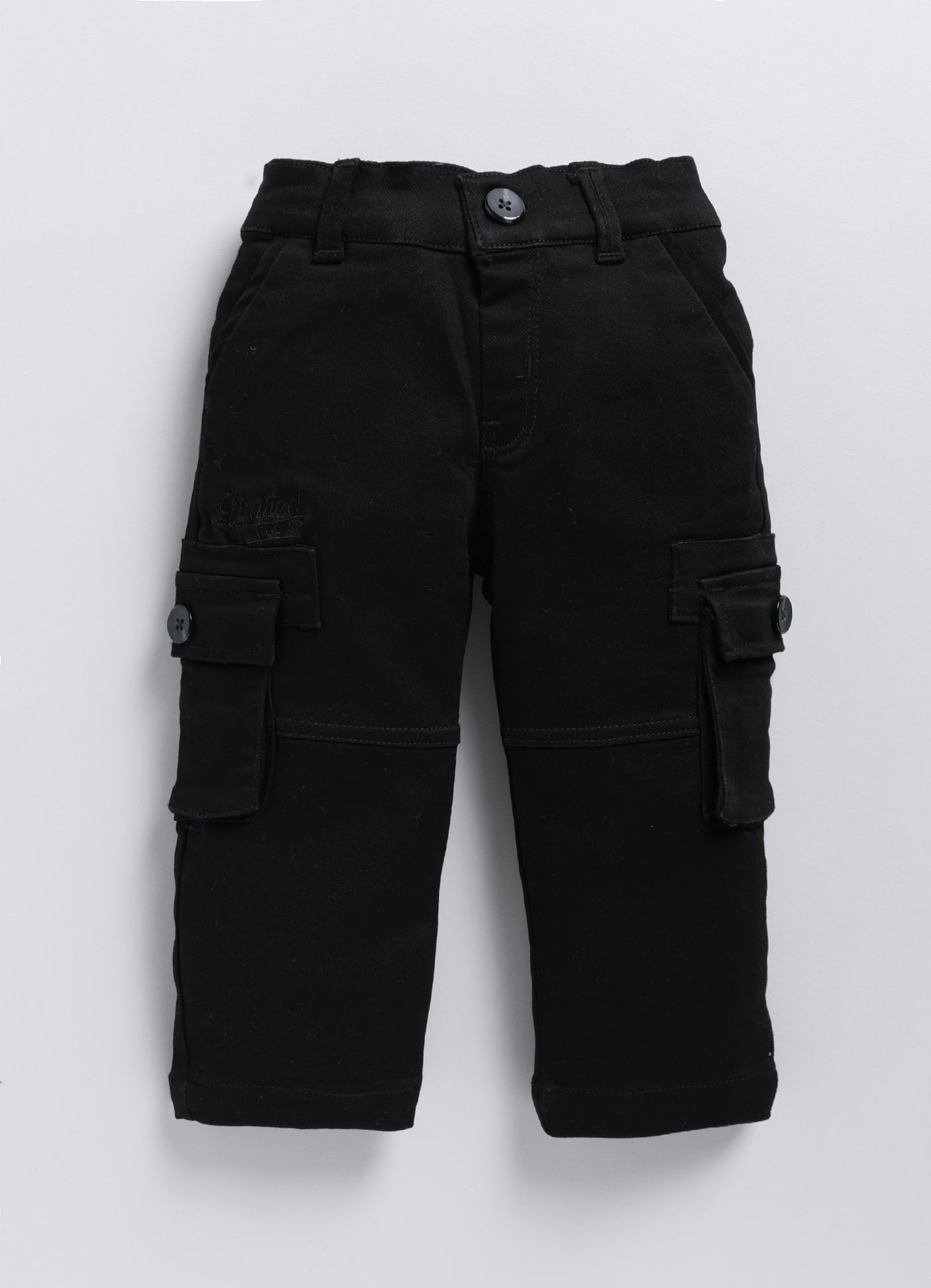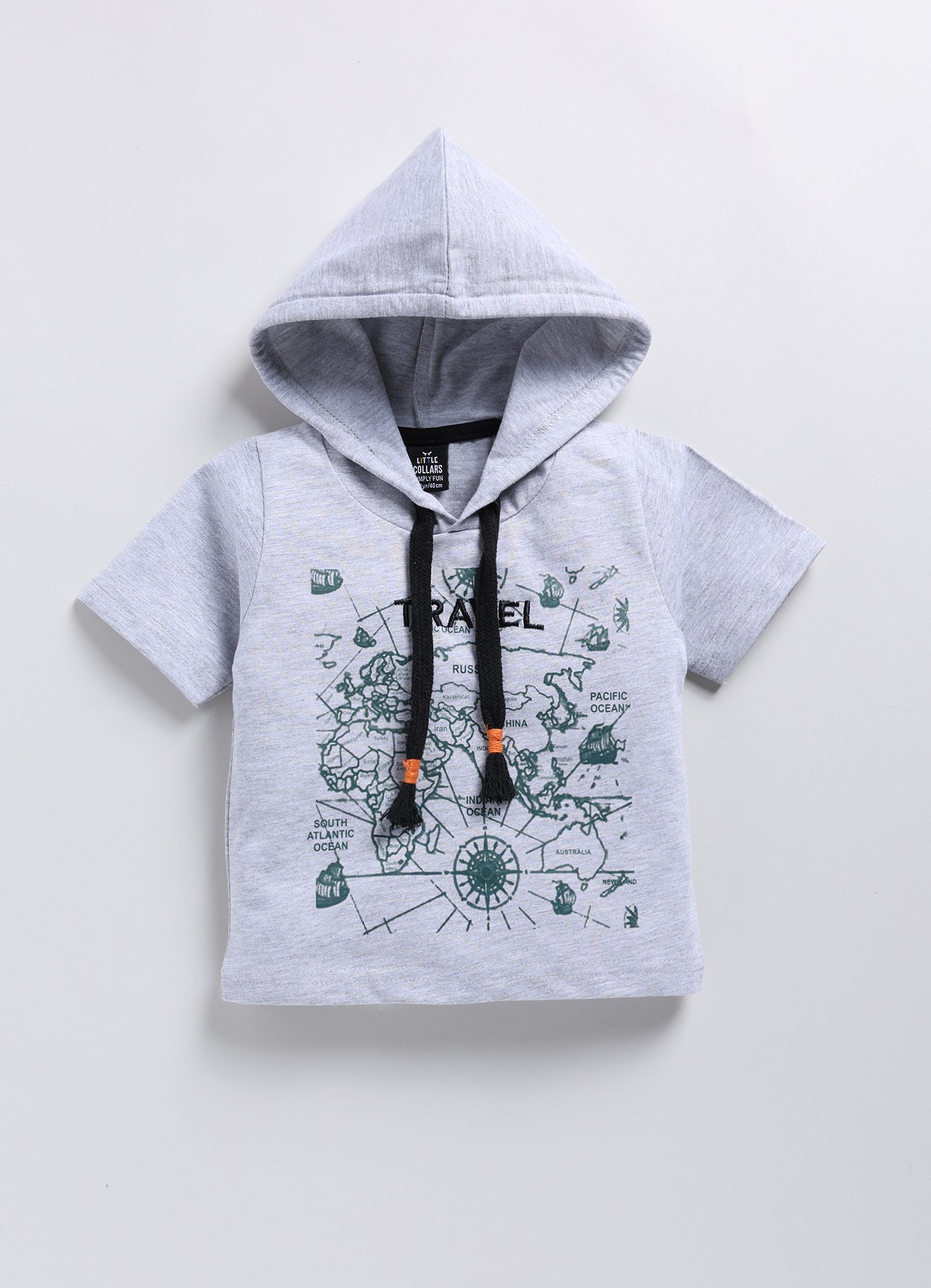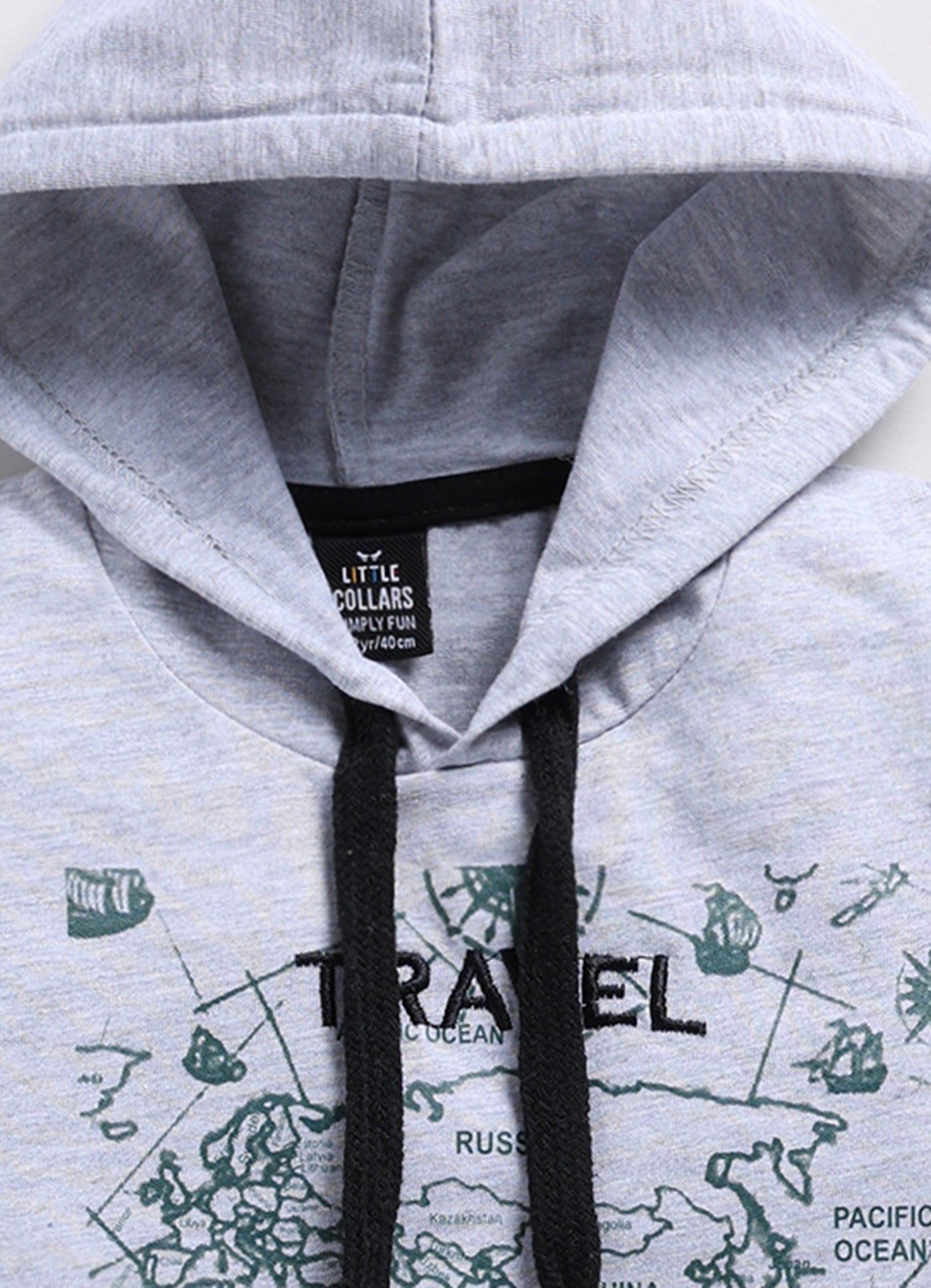 Casual and comfortable three-piece outfit for a young boy, perfect for everyday wear or playtime. The color scheme gives natural and earthy feel. The focal point is the checkered hooded jacket with full sleeves. It features a button-up closure, front pockets and a drawstring on the hood. A cute printed and embroidered melange Travel tshirt adorns the chest, adding a playful touch. The outfit is paired with a pair of cargo pants.