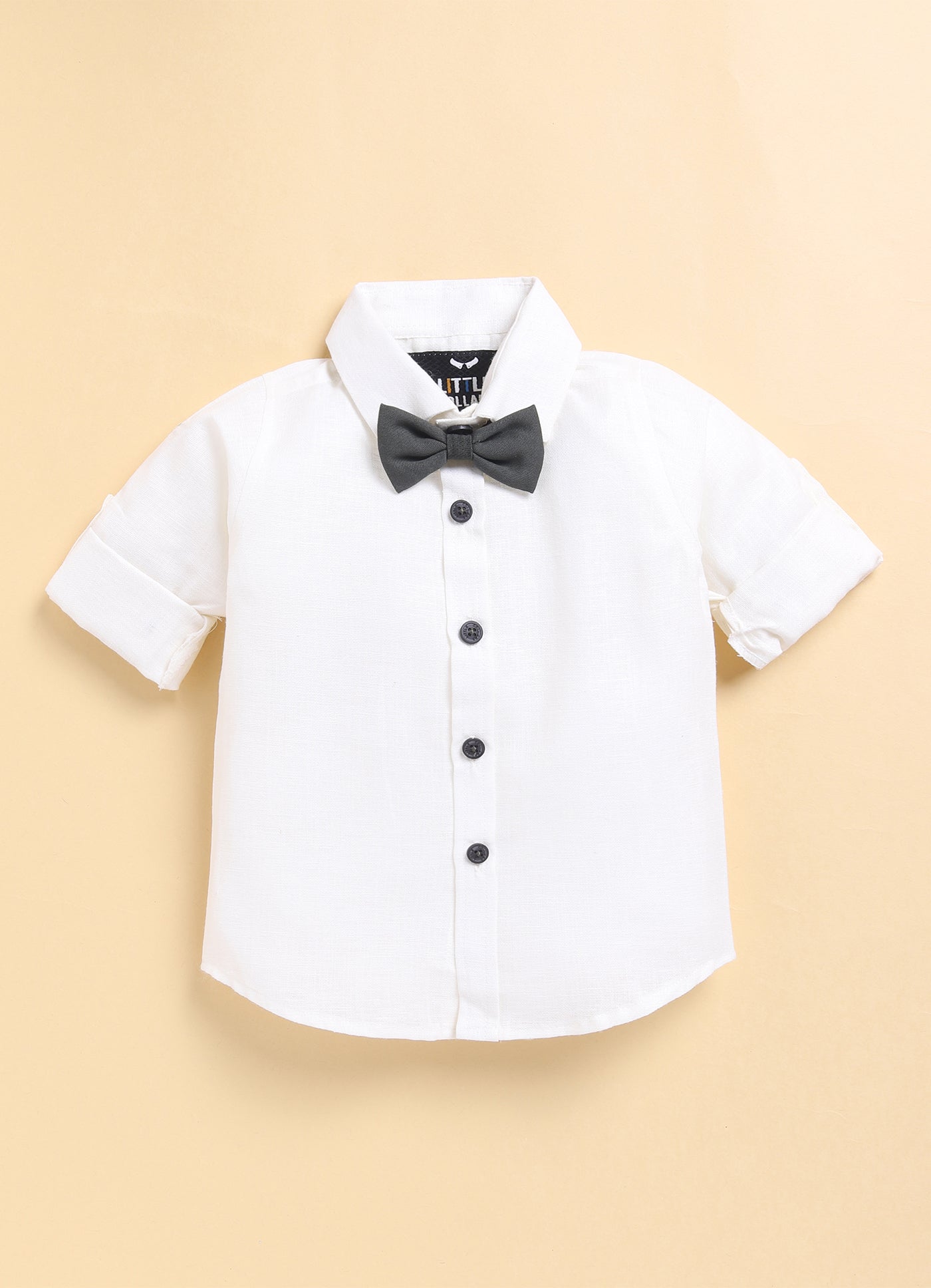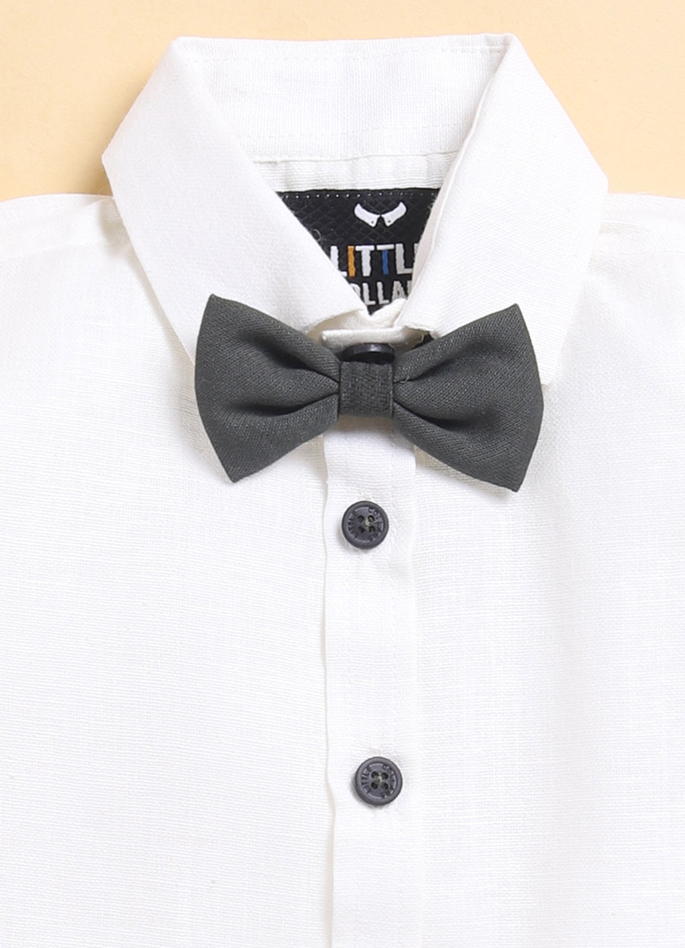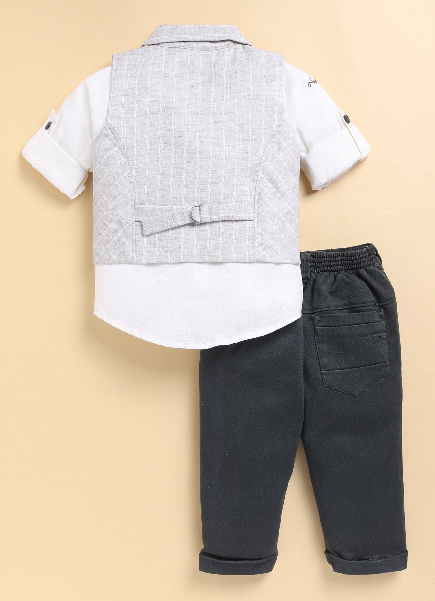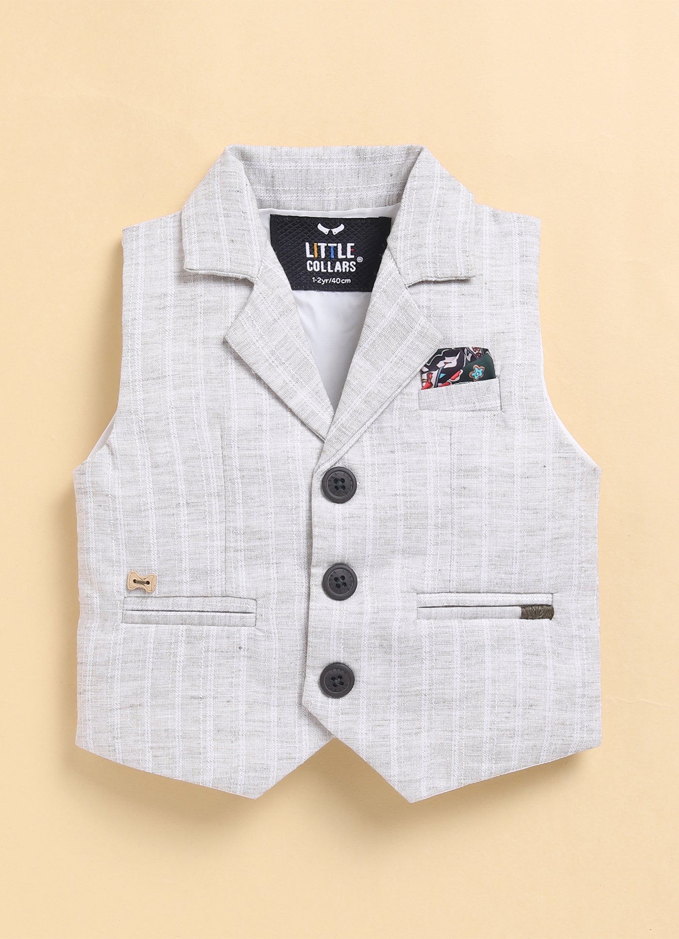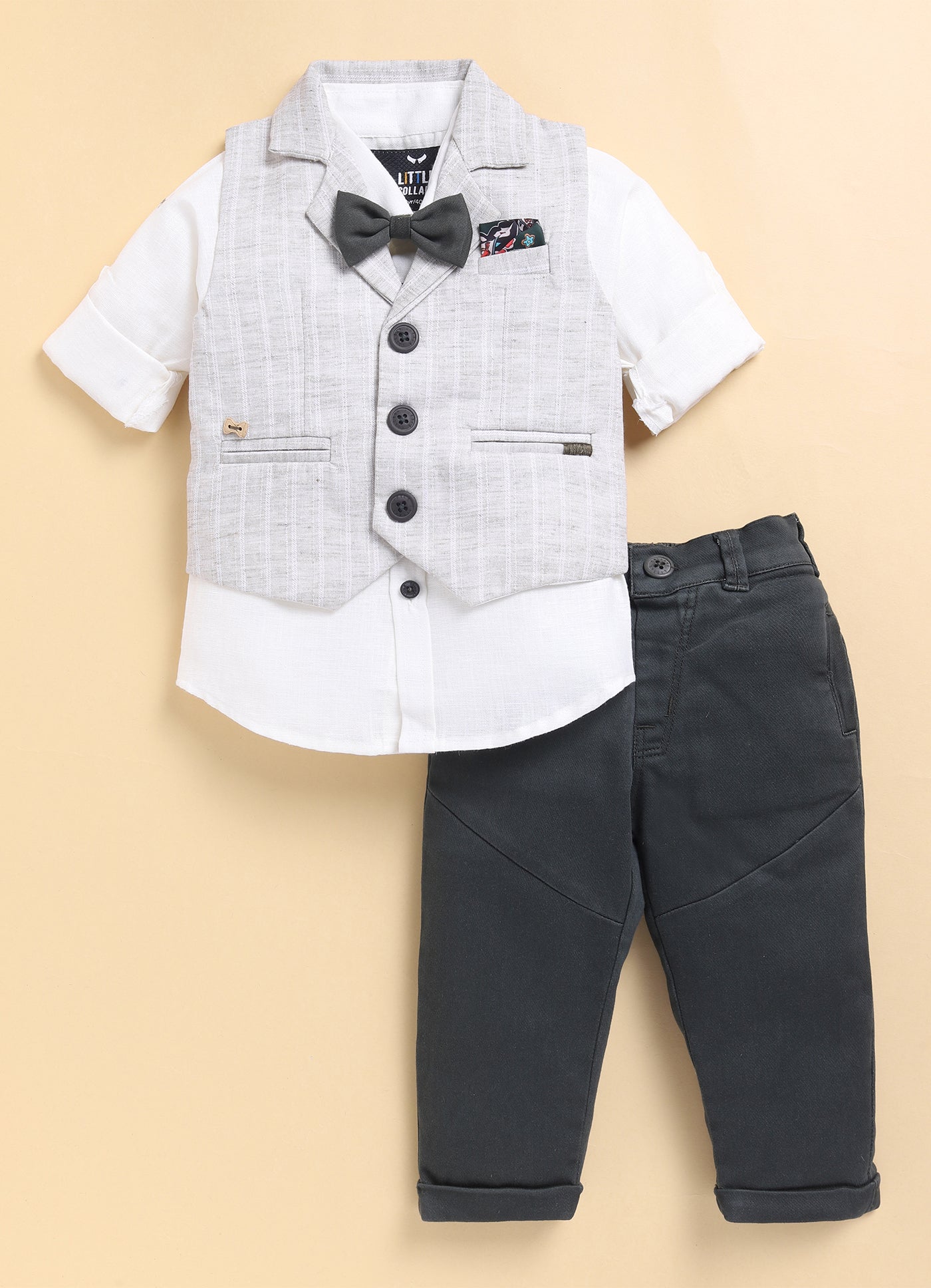 This charming 5 piece set is perfect for your little gentleman's special occasions. The set includes a crisp shirt, a stylish waistcoat/vest with a matching bow tie and stole/scarf, and contrast pants. The vest features a textured-like finish for a touch of luxury. The printed stole is stylish.