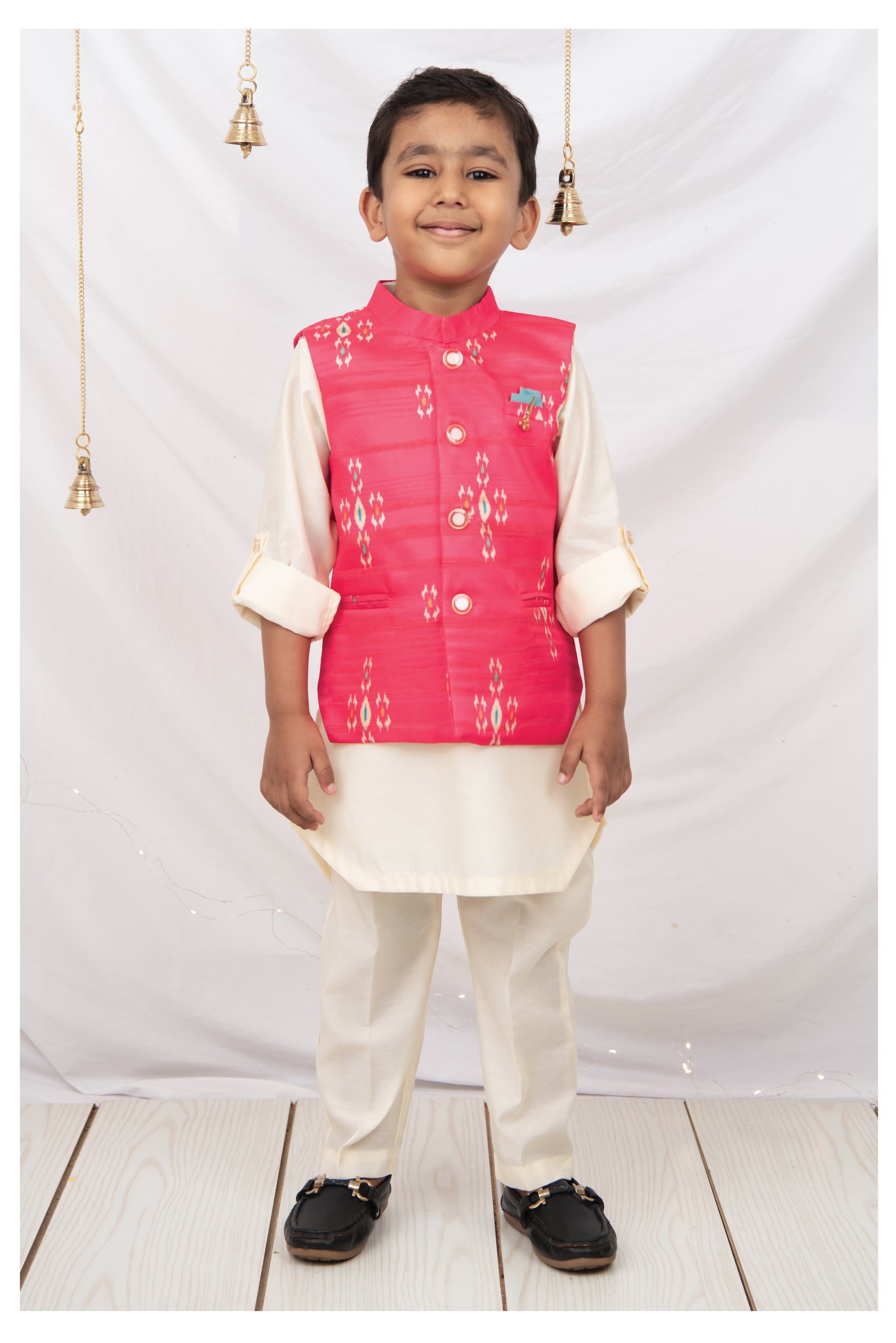 This LITTLE COLLARS fashion-forward silhouette is timeless and aesthetically beautiful. An ideal piece for all Rakhi/Diwali/Ramadan/Indian parties and weddings! Elegant bright Ikat printed Nehru jacket has beautiful buttons and is paired with cream kurta and same coloured pajama set. This set is a perfect combination of opulence with comfort. The set can be worn without the jacket also as the kurta looks dapper.