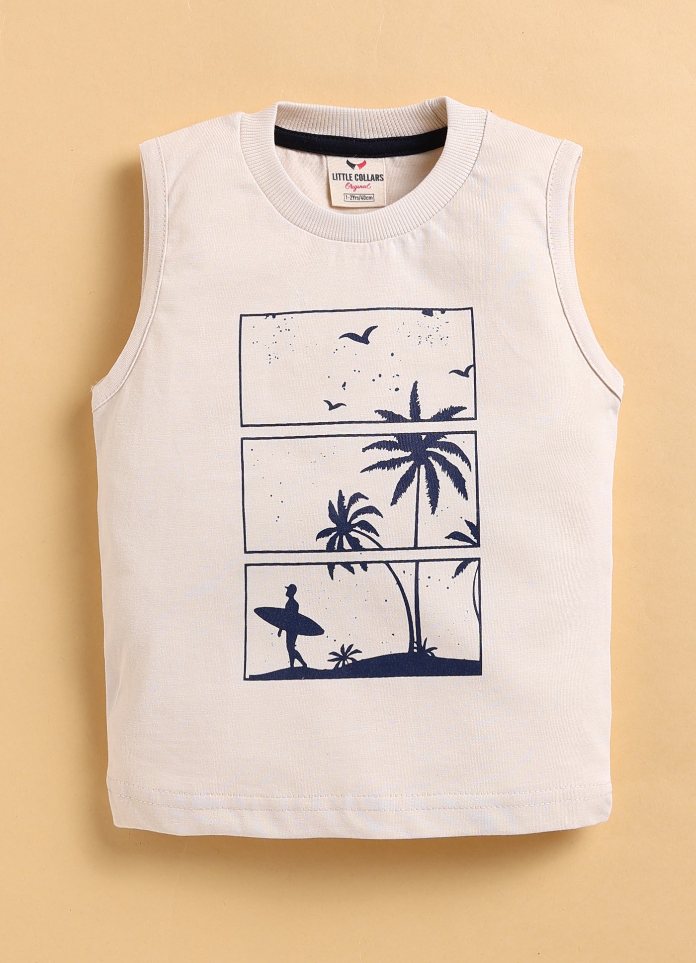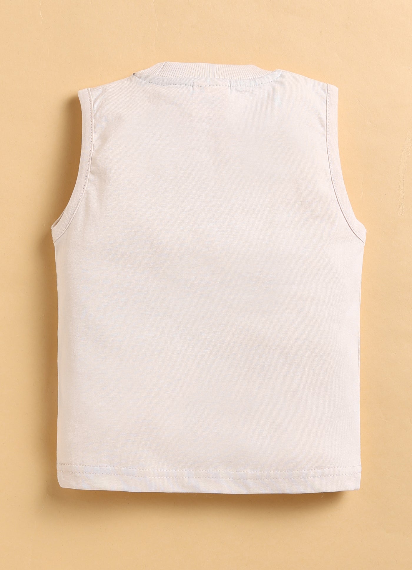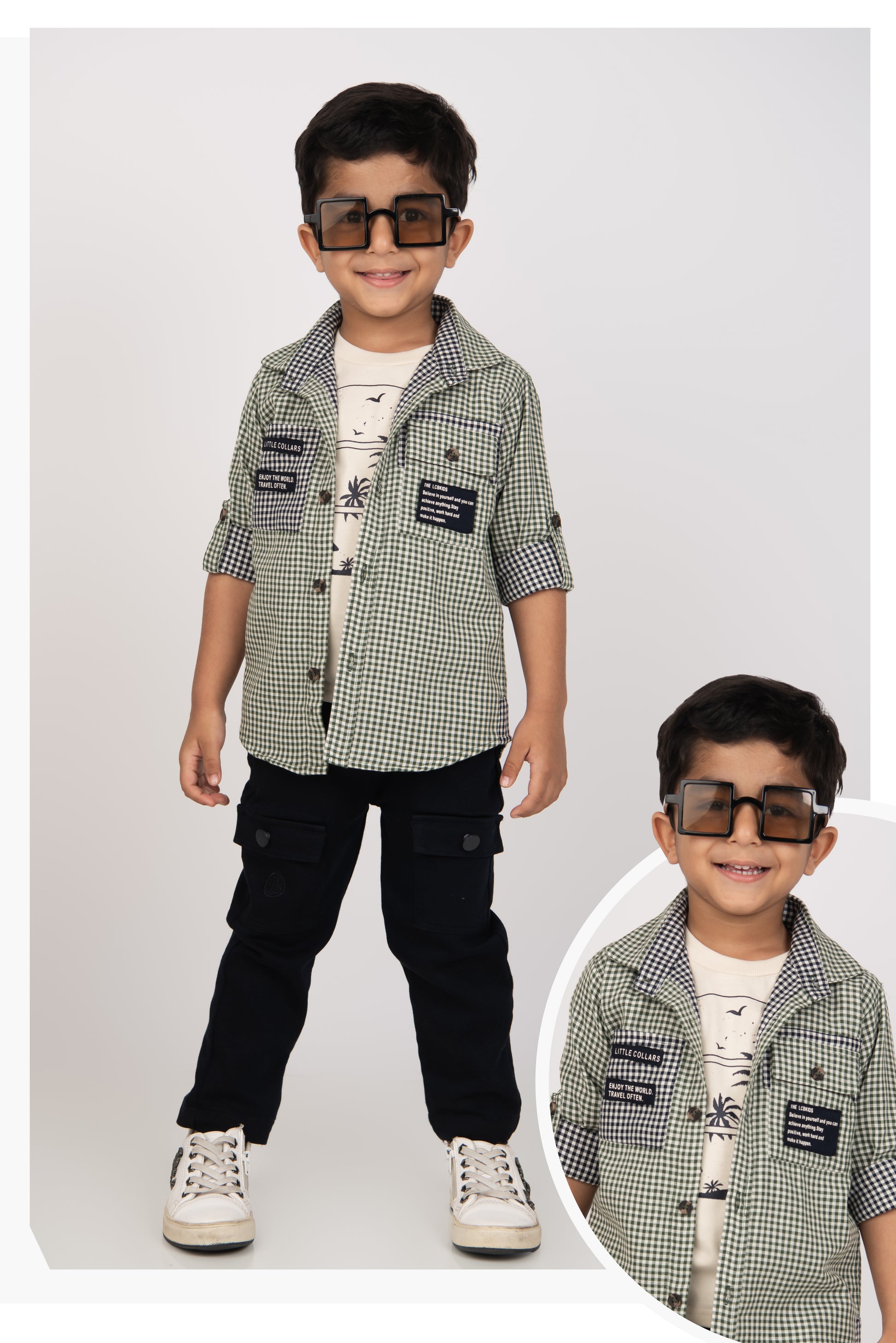 This stylish and cozy outfit features pure cotton double cloth shirt with pocket details. Sleeveless printed t-shirt is fun. Cargo-style pants with pocket accents for a trendy and functional look. Perfect for a casual yet fashionable birthday wear/ outer wear look!