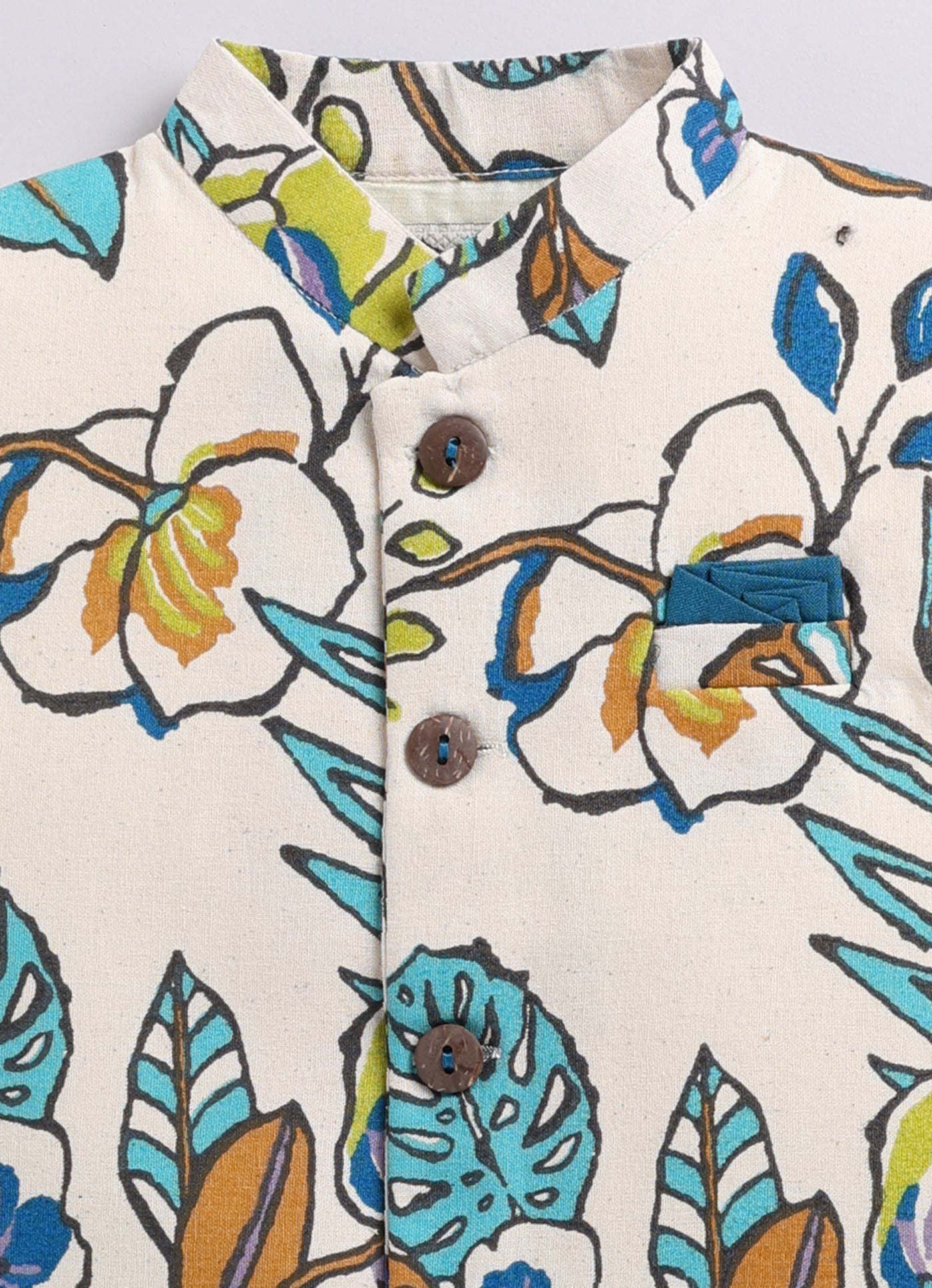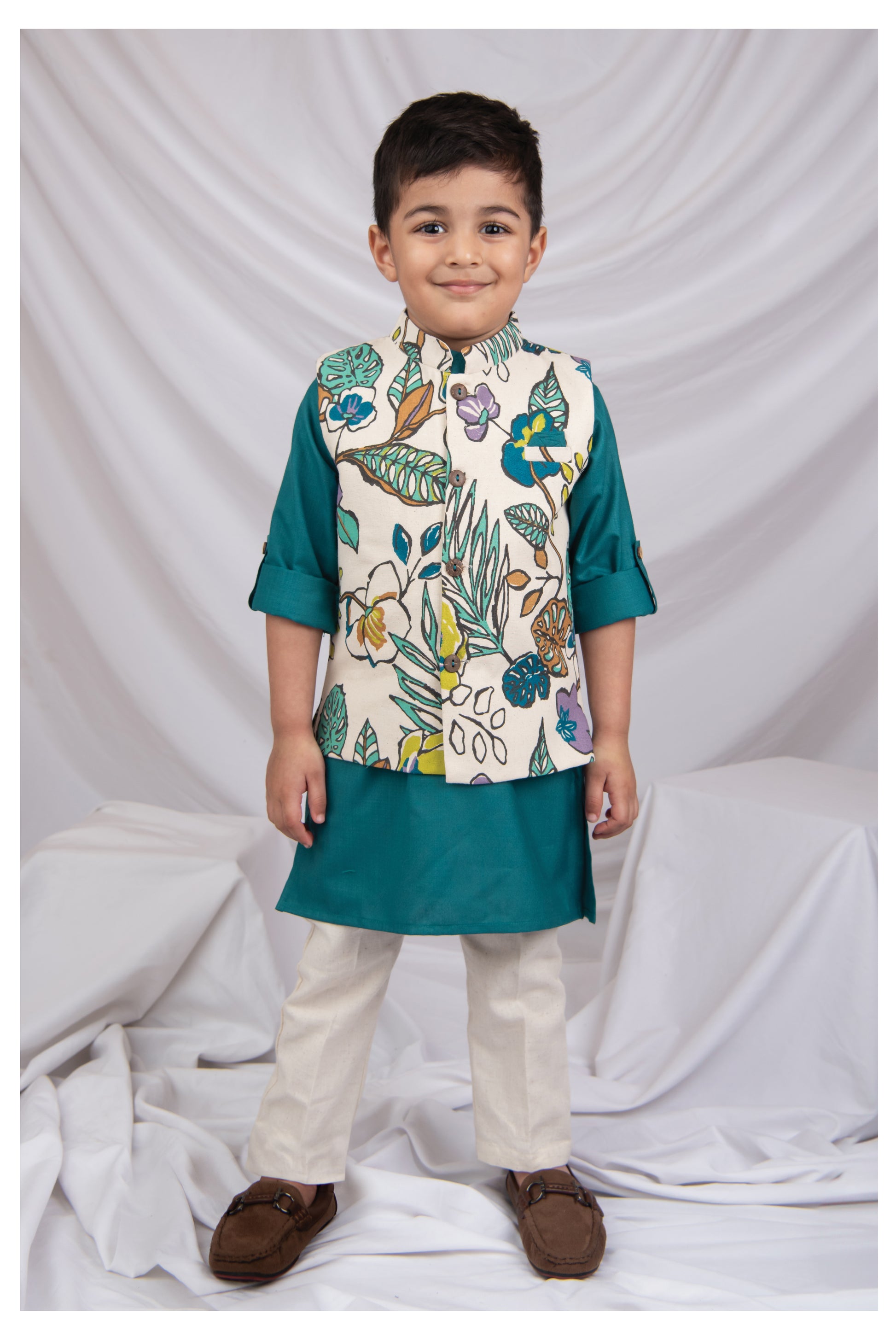 Pure Cotton Woven Full Sleeves Kurta Pajama with Multi Colour Floral Nehru Jacket Ethnic Set- Blue