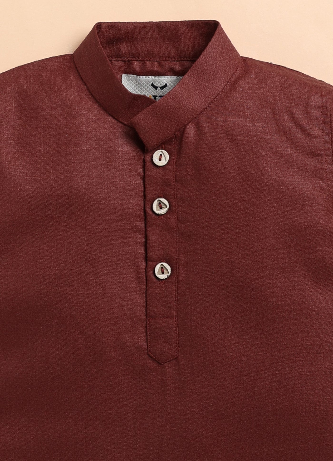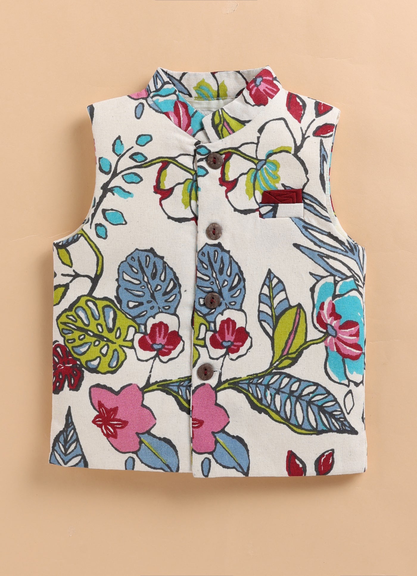 Pure Cotton Woven Full Sleeves Kurta Pajama with Multi Colour Floral Nehru Jacket Ethnic Set- Maroon