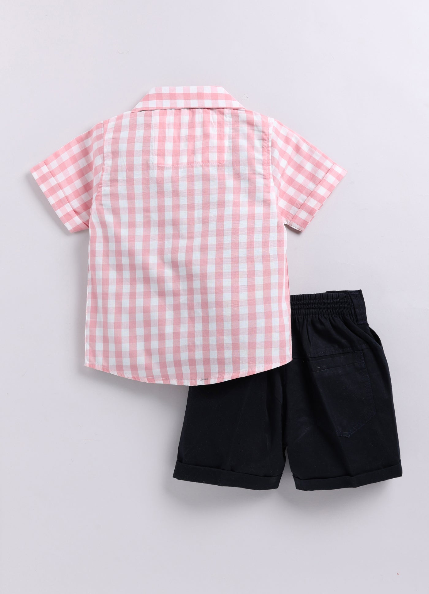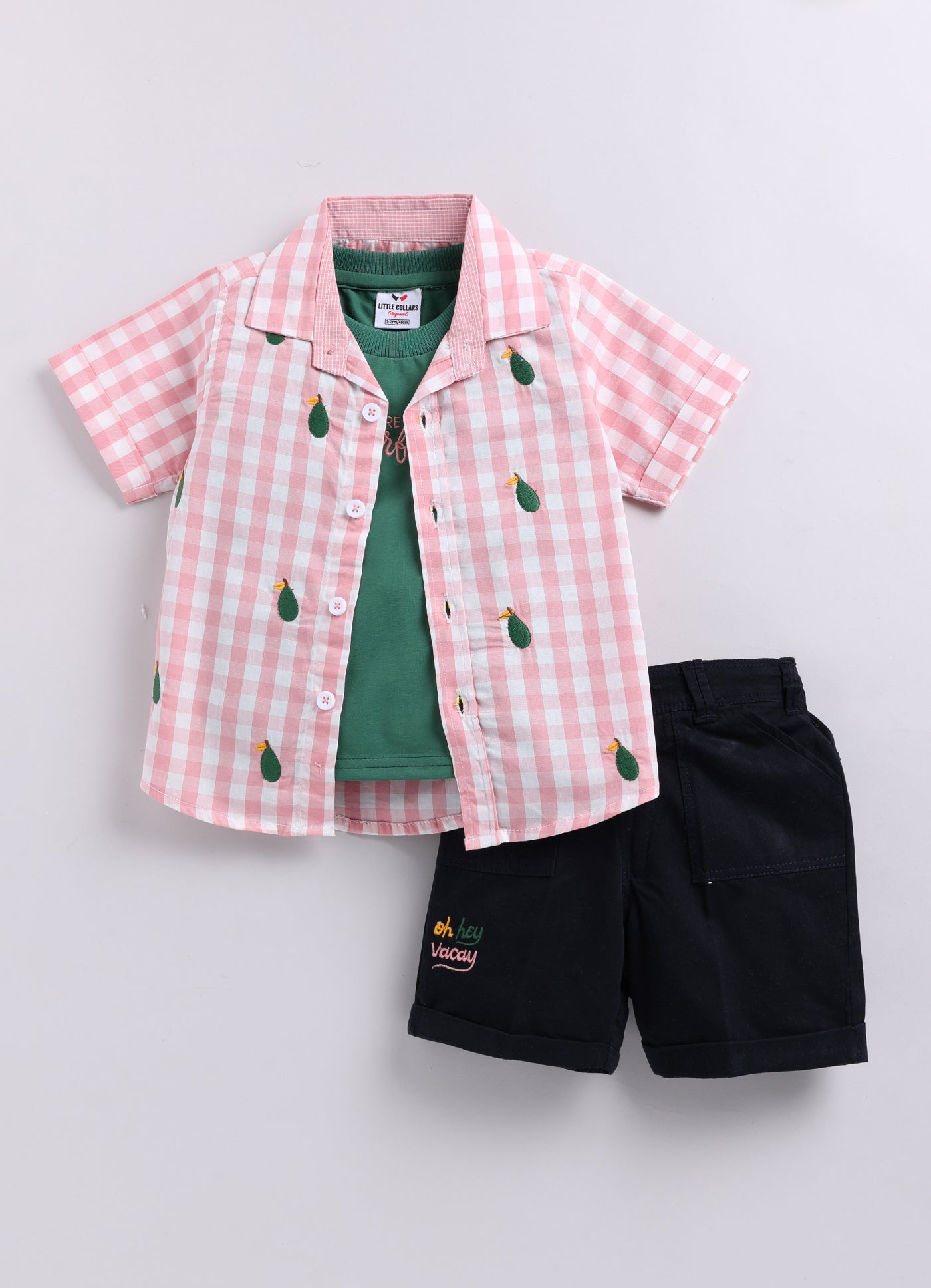 Pure Cotton Woven Half Sleeves Checks Shirt with Pear Embroidery, Pant with T-shirt Casual Set- Pink