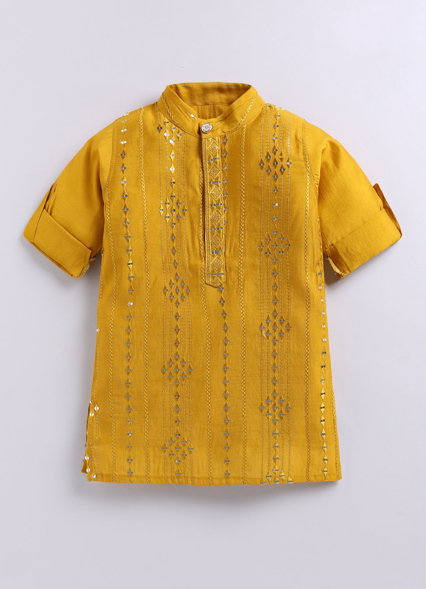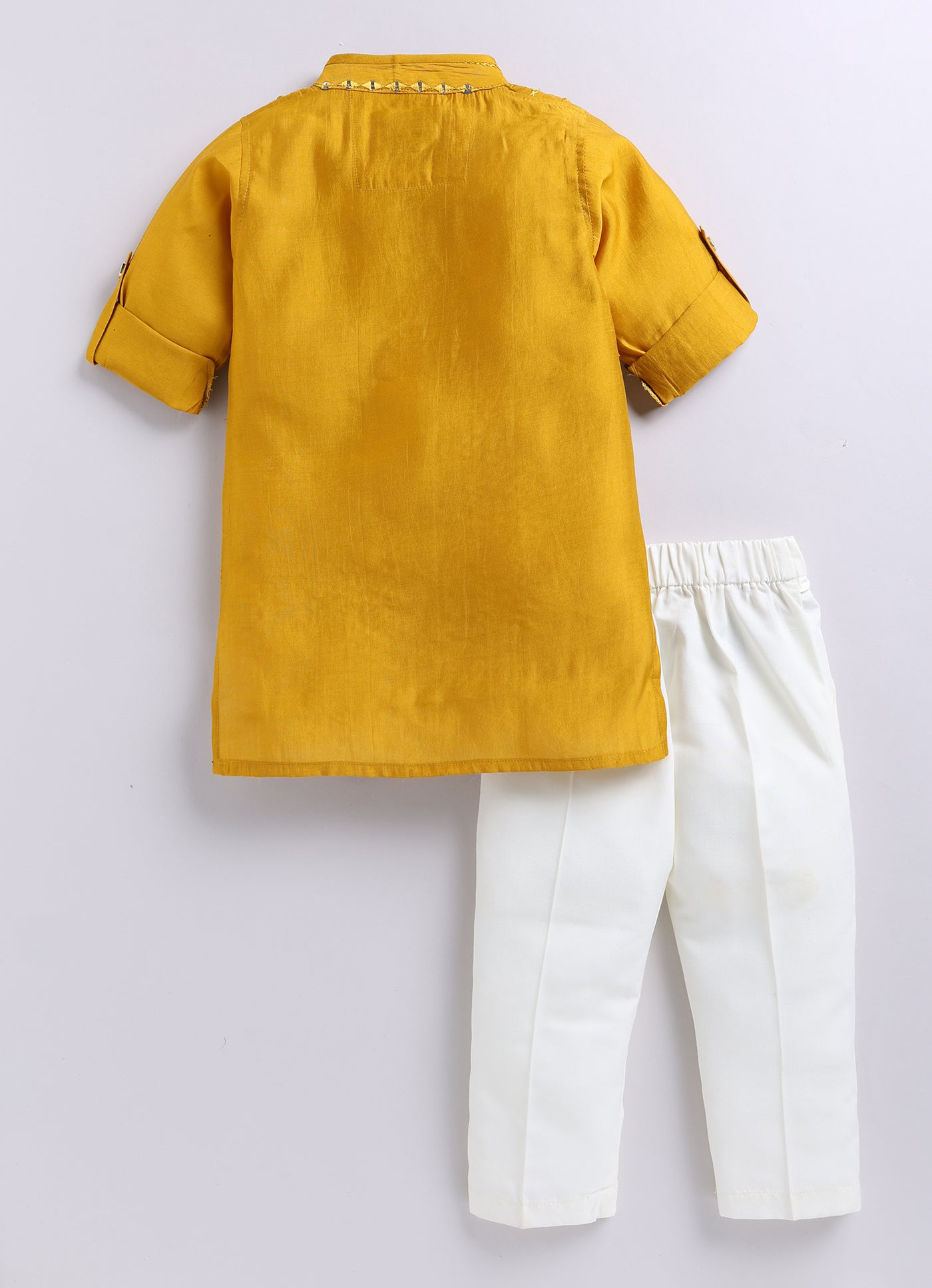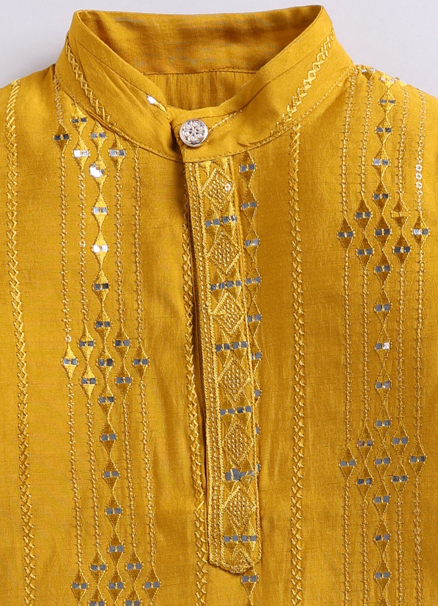 Silk Blended Woven Full Sleeves Pack of 2 Solid Embellished Kurta Pajama Ethnic Set- Mustard
