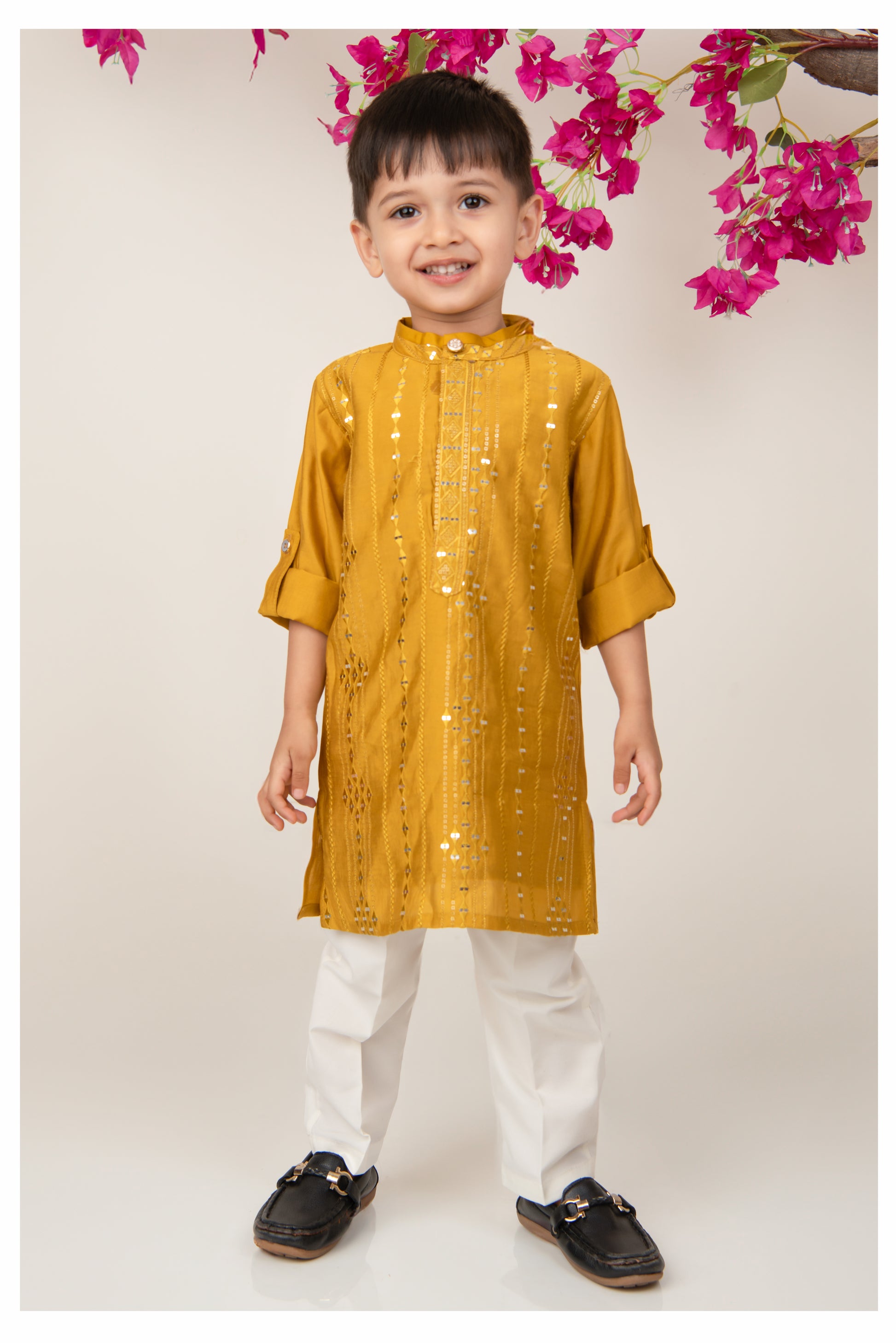This LITTLE COLLARS fashion-forward silhouette is timeless and aesthetically beautiful. An ideal piece for all Rakhi/Diwali/Ramadan/Indian parties and weddings! Elegant  Nehru jacket has beautiful sequins work and is paired with roman silk kurta and pajama set. This set is a perfect combination of opulence with comfort. The set can be worn without the jacket.