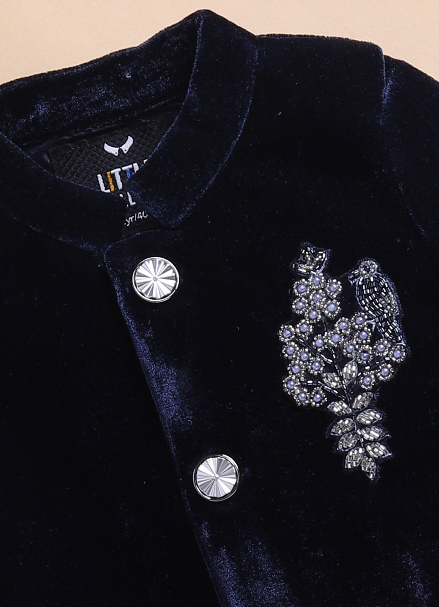 Suede Velvet Woven Full Sleeves Hand Embellished Motiwork Motif Design Sherwani Prince Coat Ethnic Wear Set - Navy