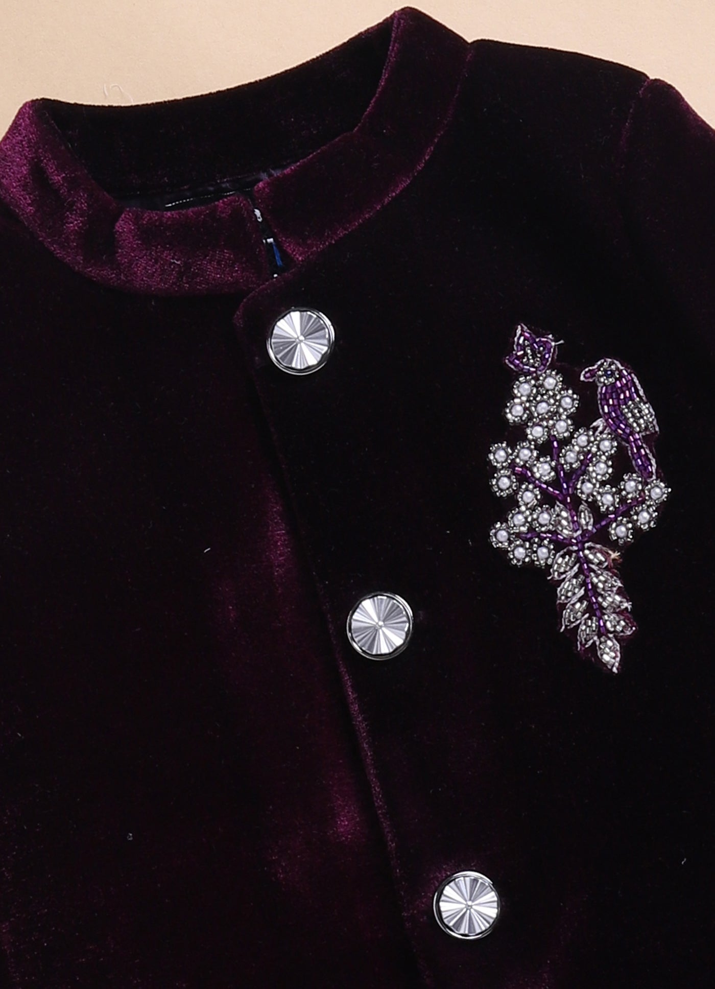 Suede Velvet Woven Full Sleeves Hand Embellished Motiwork Motif Design Sherwani Prince Coat Ethnic Wear Set - Wine