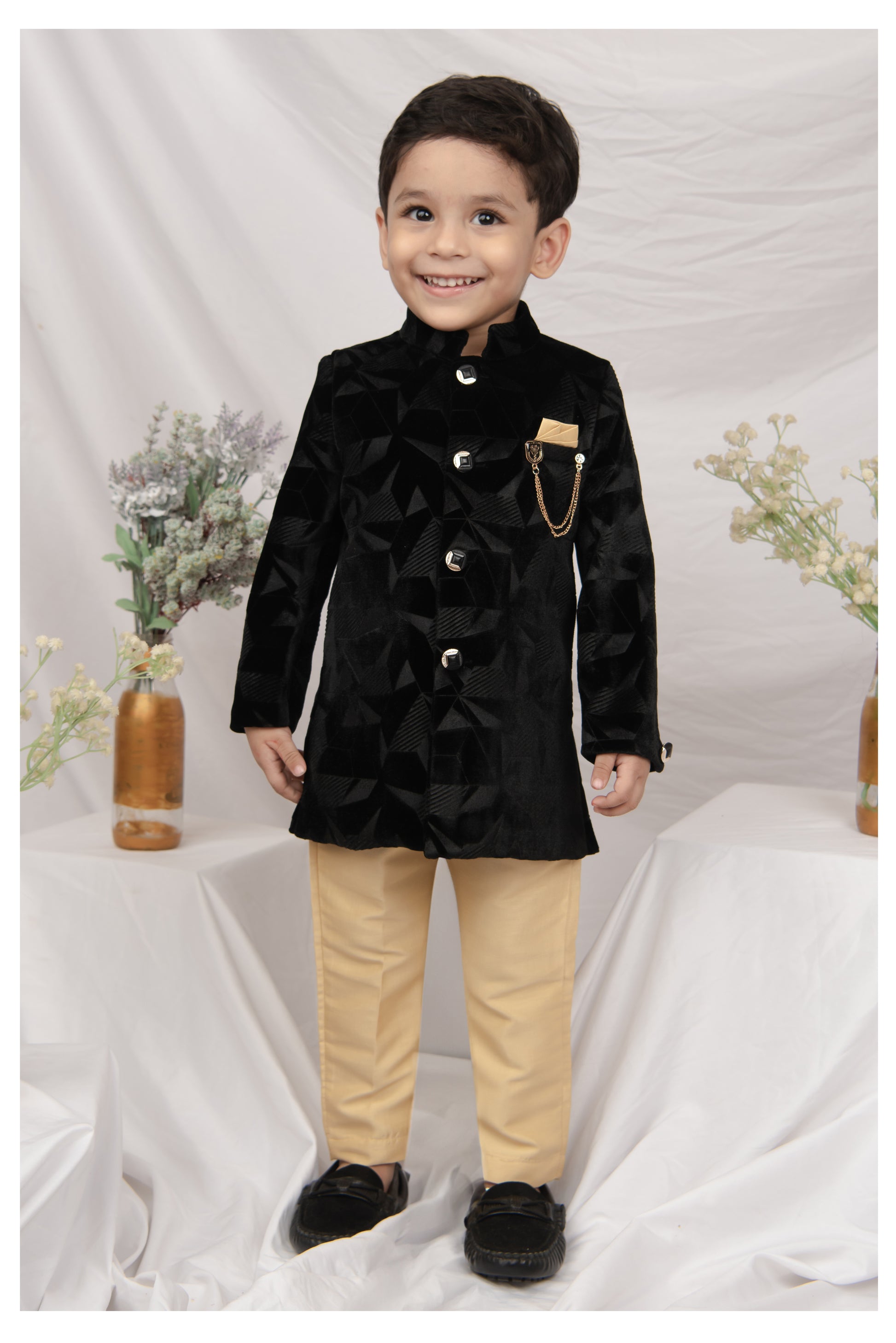 This LITTLE COLLARS fashion-forward silhouette is timeless and aesthetically beautiful. An ideal piece for all Rakhi/Diwali/Ramadan/Indian parties and weddings! Elegant Achkan has beautiful Sequin & Embellished & Abstract Embroidered is paired with Pajama set. This set is a perfect combination of opulence with comfort.
