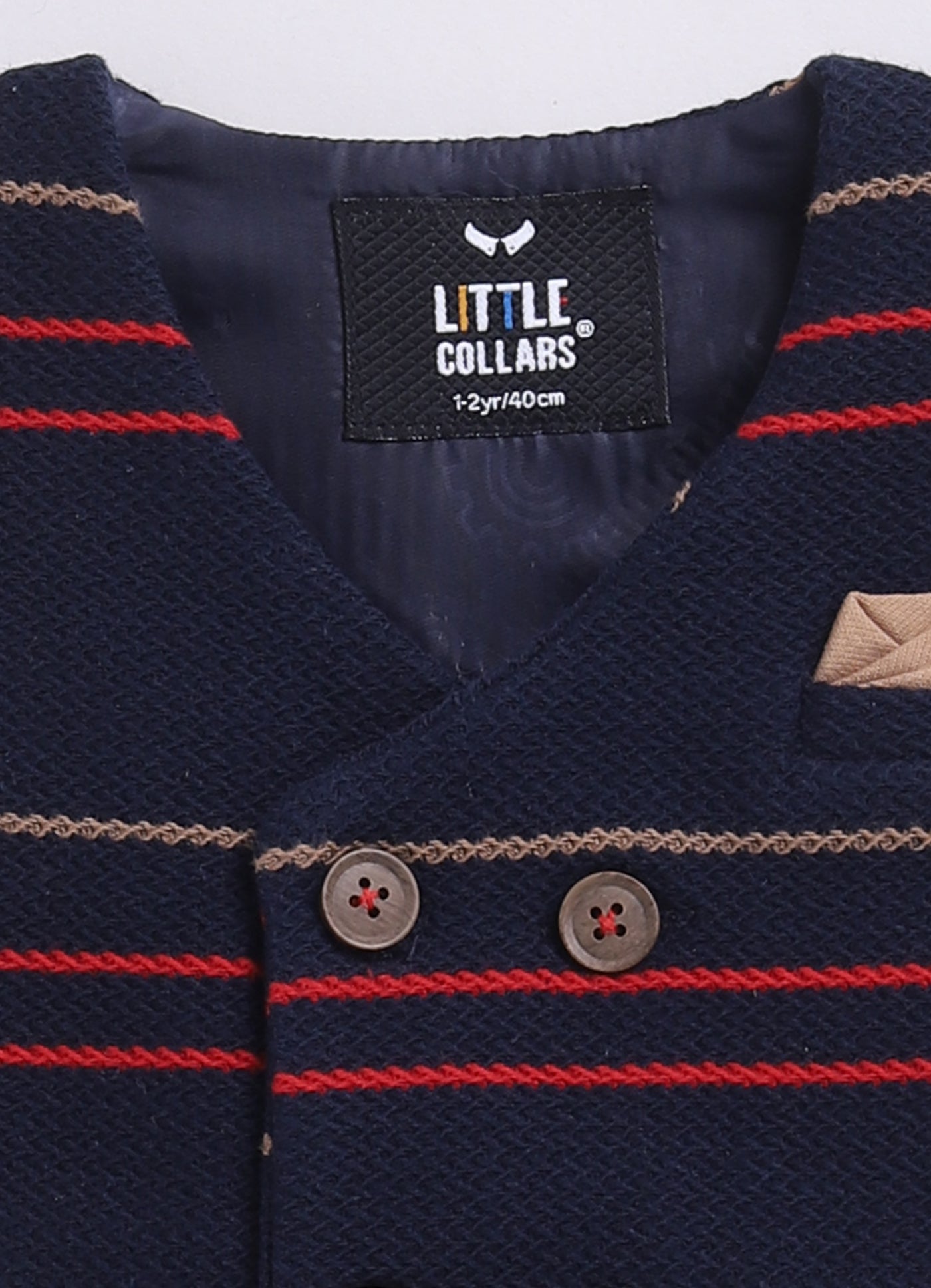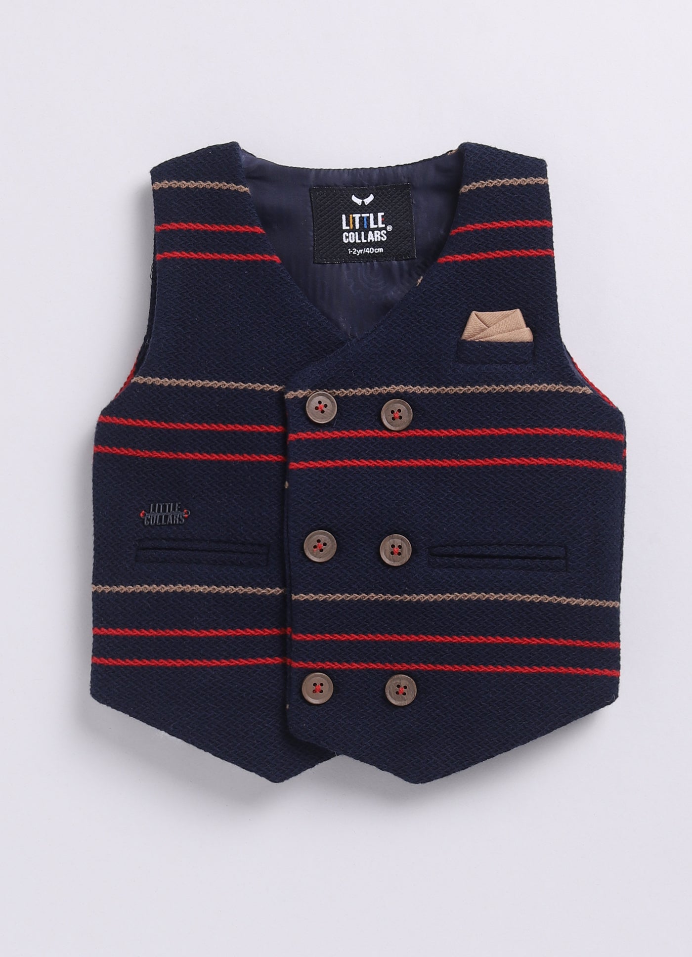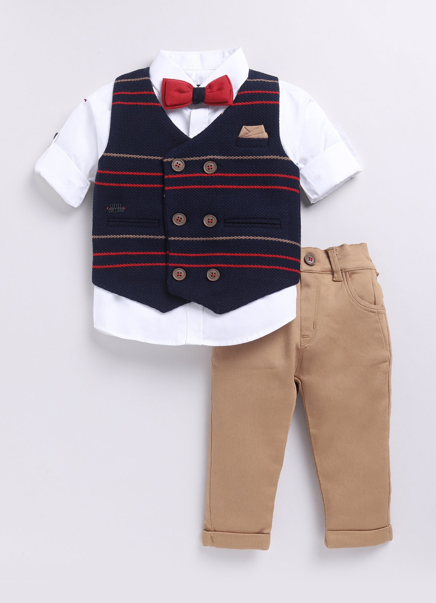LITTLE COLLARS has upgraded the classic version of two-piece waistcoat set and elevated its style it to make it super cool partywear set, wearable on special occasions. The striped waistcoat gives such a chic look. The fabric of the shirt and pant is super soft. the garment is adorned with classy navy bow and pocket square